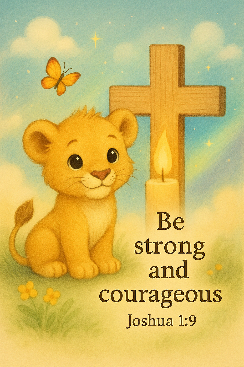 Inspire courage and faith in young hearts with this Christian Scripture Wall Art featuring Joshua 1:9, illustrated with a joyful lion cub, glowing candle, butterfly, and wooden cross. Designed to uplift and encourage, this printable is perfect for Christian homeschool decor, Sunday school classrooms, and devotional kits for children and families. With its warm colors and gentle symbolism, it’s a powerful reminder that God’s strength is always near.