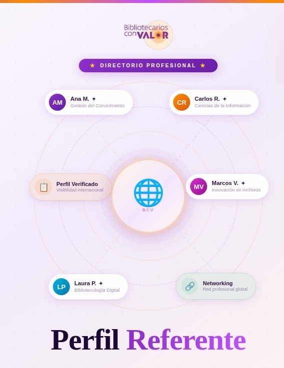Destaca tu trayectoria y forma parte del Directorio Profesional de Bibliotecarios con Valor, un espacio creado para visibilizar a bibliotecarias, técnicos y profesionales de la información que desean proyectar su trabajo más allá del ámbito local.