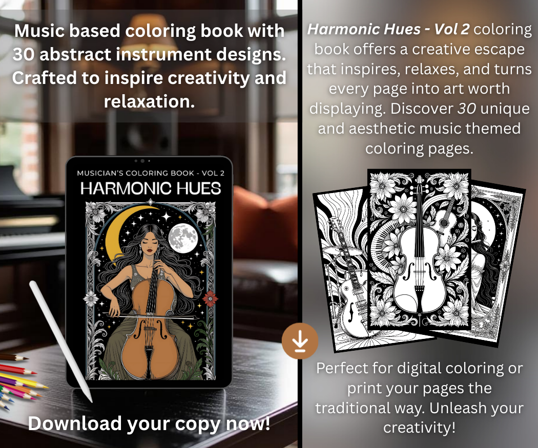 🎨 Music-inspired relaxation returns with Harmonic Hues - Vol 2. Featuring 30 new abstract instrument designs, this coloring book offers a calming, creative escape. Perfect for digital or traditional coloring—unleash your imagination one page at a time.