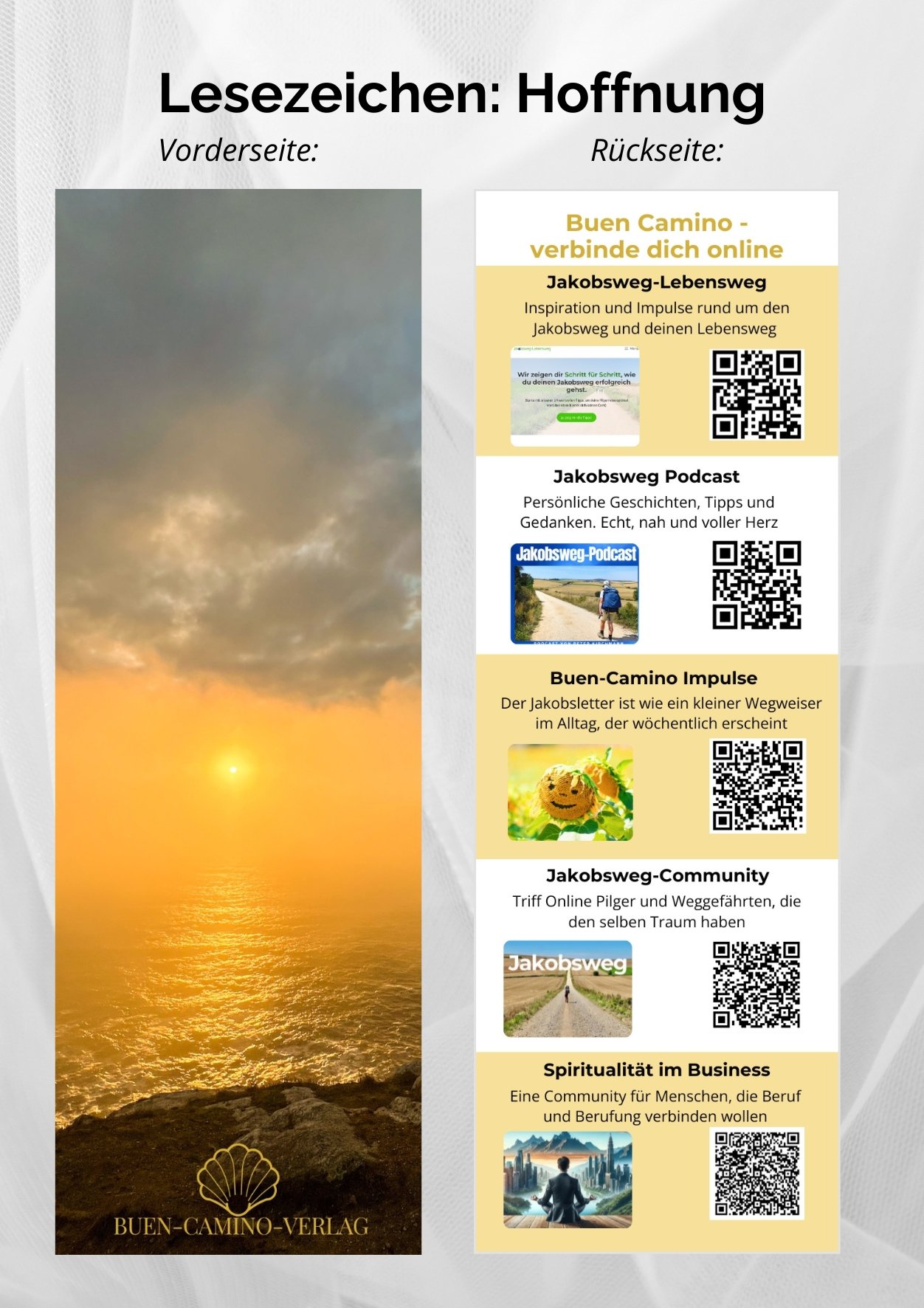 Die Rückseite verbindet dich direkt mit der Buen Camino Welt – mit Podcast, Impulsen, der Jakobsweg-Community und Inspirationen für deinen Lebensweg.