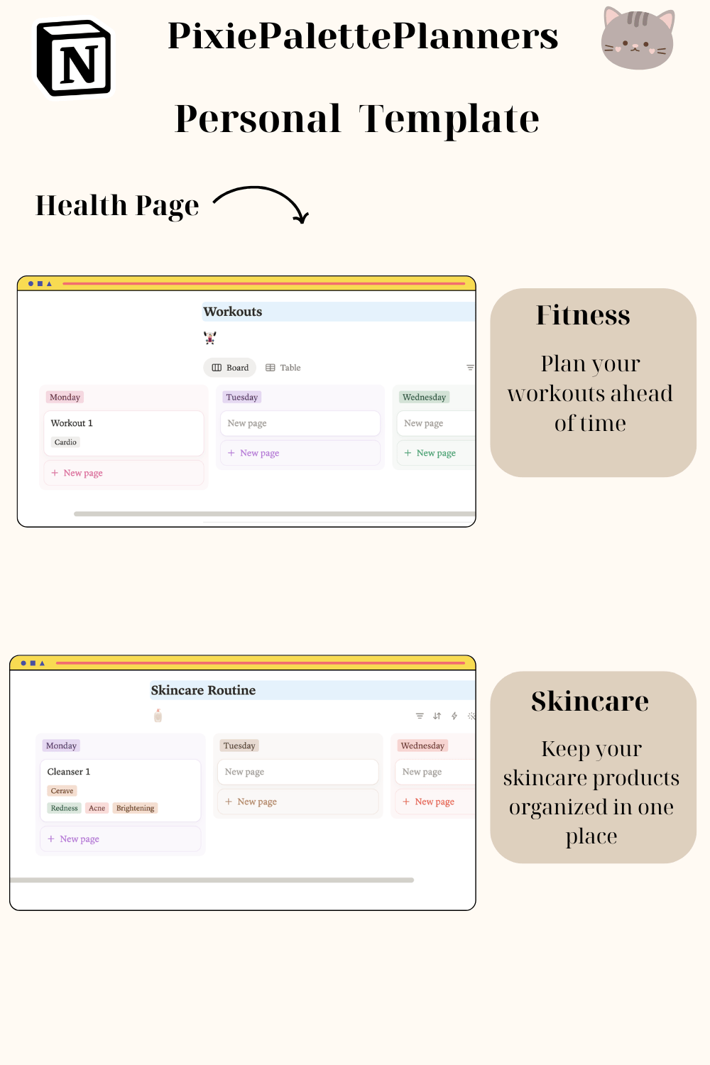 - Log workouts, track medications/supplements, and skincare routine in the Health Page