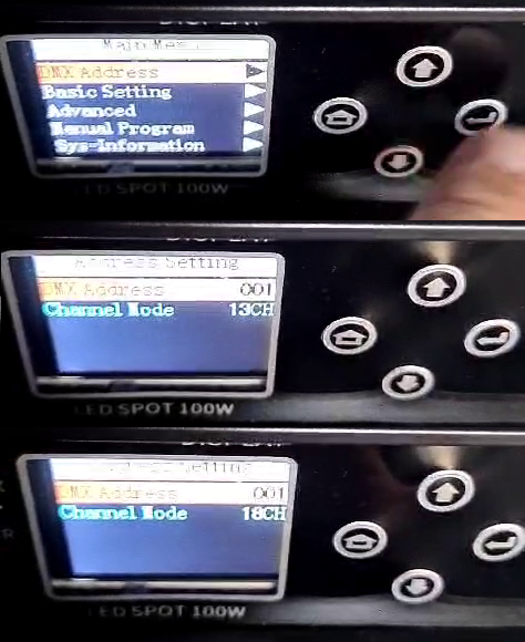 * Verifique, desde el display del equipo, que el menú "DMX Address / Channel Mode" muestre los modos "13CH" y "18CH" (ver tercer foto).