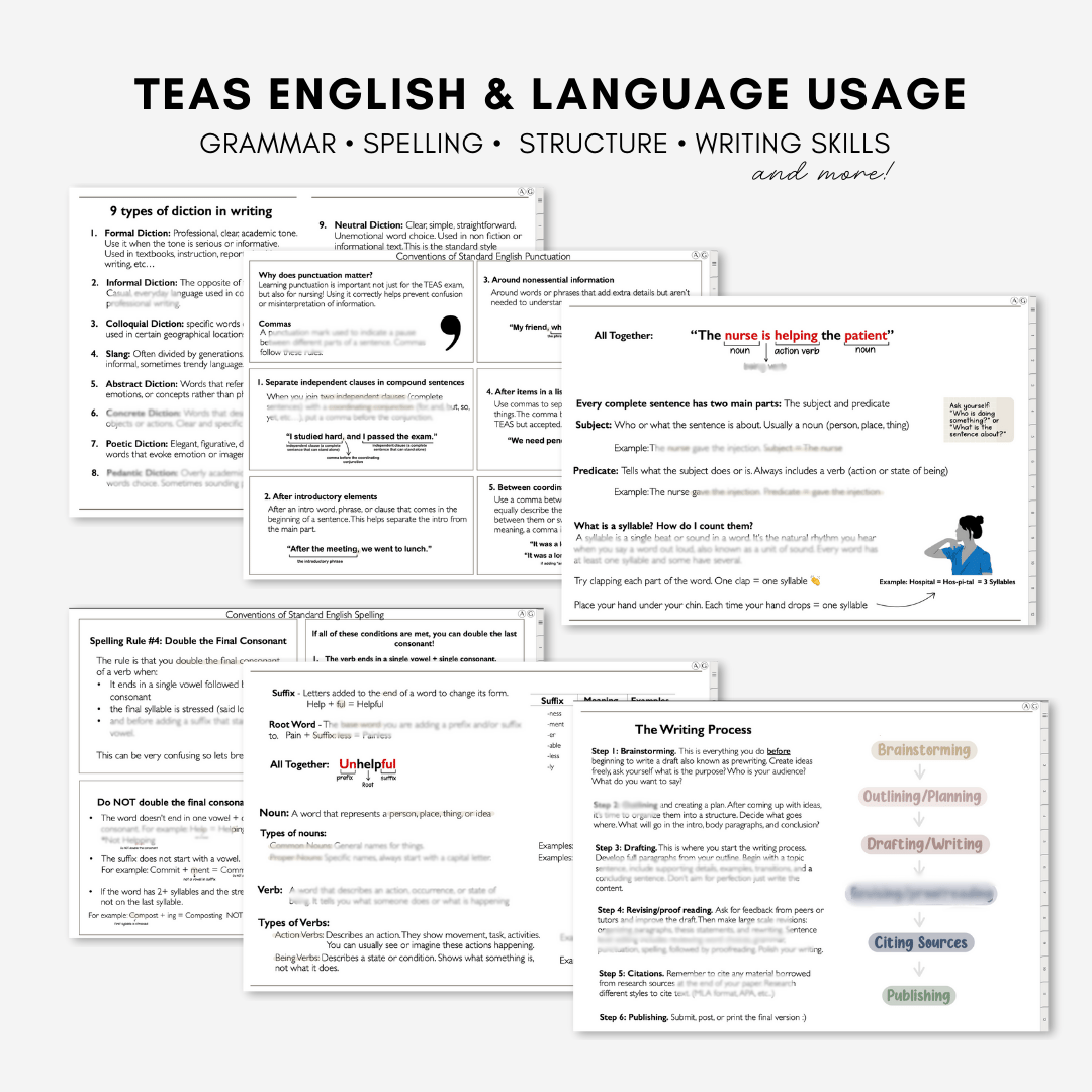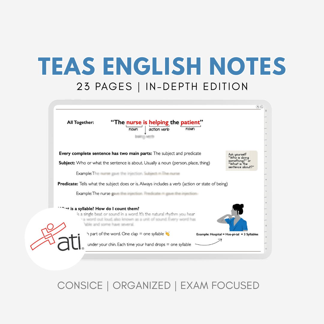 In-depth English & Language Usage notes I created while studying for the TEAS exam. These notes are designed for longer study sessions and for building a strong understanding of grammar, language rules, and writing conventions tested on the TEAS. Organized by topic and focuses on how English questions are tested, with rules and examples broken down clearly to make studying more efficient!