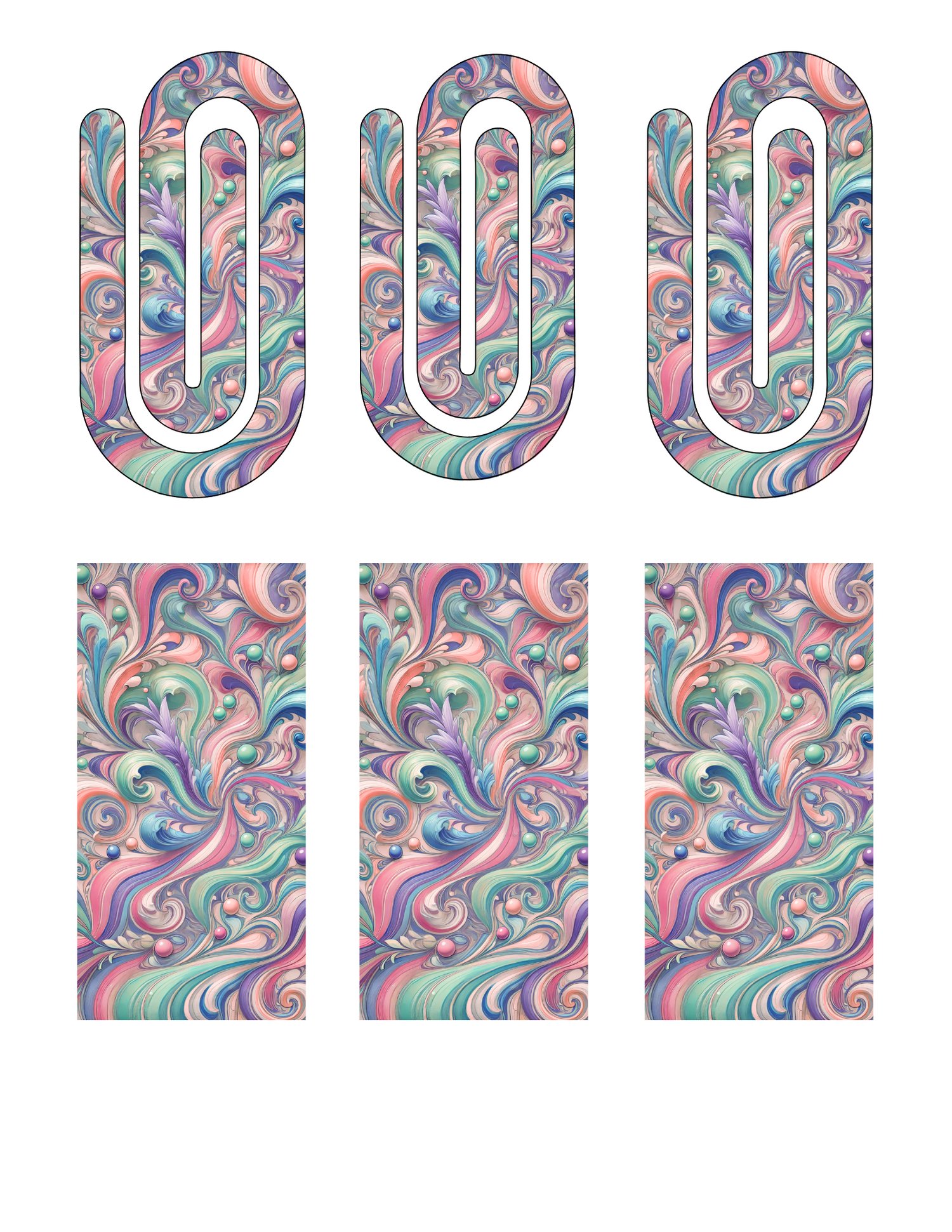 Create bold, beautiful paperclip and bookmark accessories with this easy-to-use sublimation design set! Each page features three trendy designs, with two formats per design: a paperclip shape and a matching rectangle—both sized at 2x4 inches. These designs are perfect for sublimatable blanks and are arranged so you can use them as a front-and-back pair or press them separately on individual clips or bookmarks.