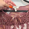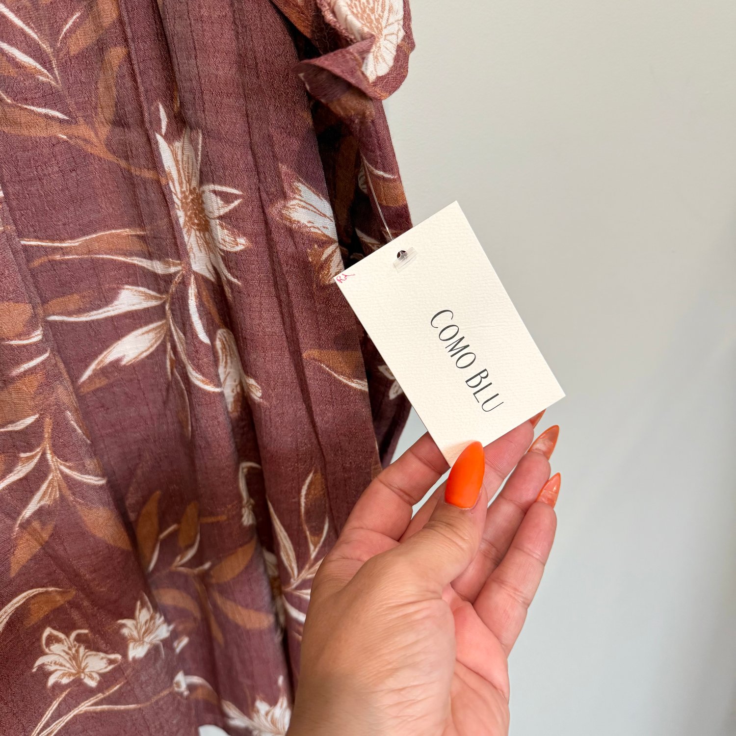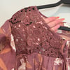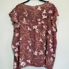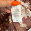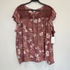 Como Blu purple-mauve lightweight ruffle cap sleeve blouse with white and dark orange florals, eyelet panel and tie detail.