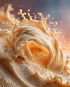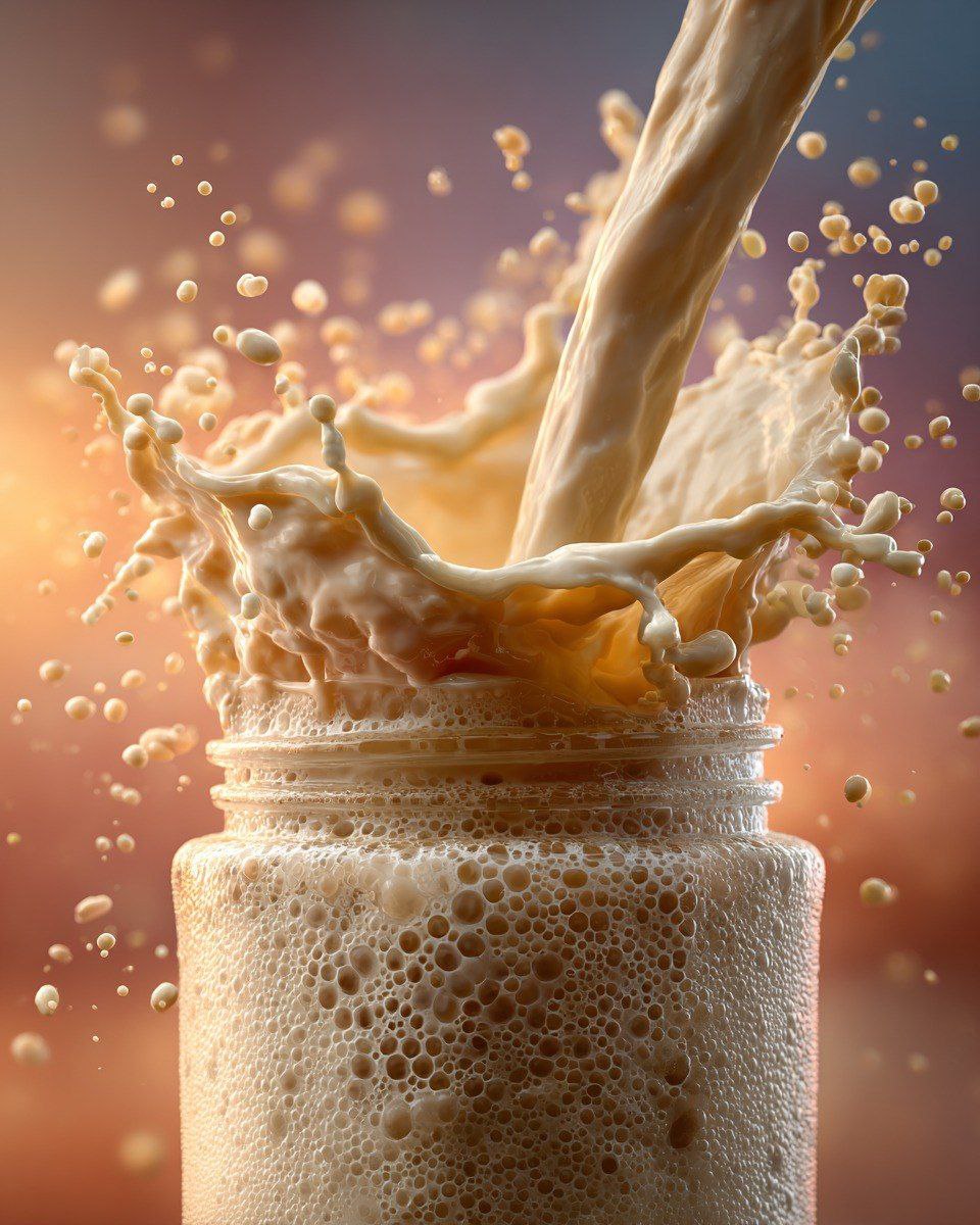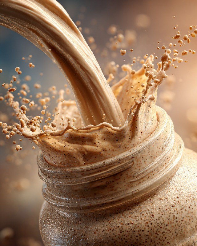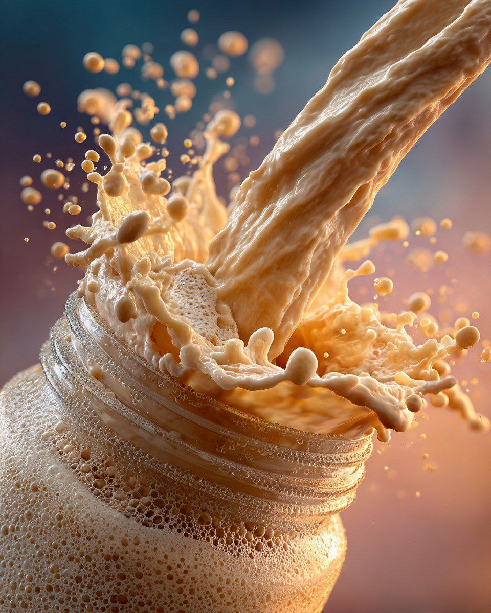 Ultra-realistic macro photography prompt of creamy protein shake pouring from a frosted shaker. Dynamic splashes frozen mid-air, soft warm lighting, shallow depth of field, warm pastel bokeh background.