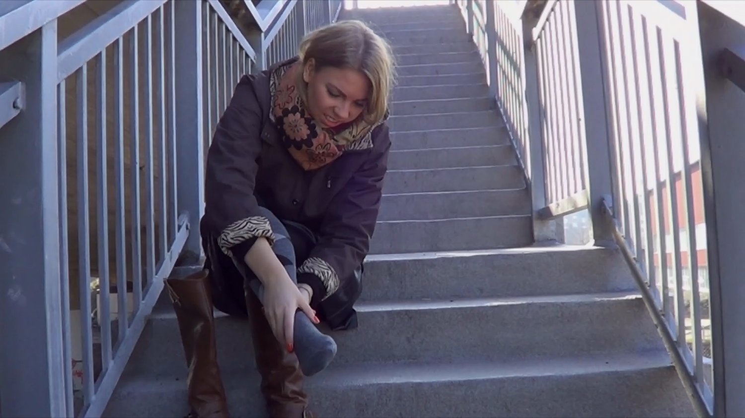 Model tiger is outside walking while talking in the phone with a friend, when suddenly, she slips and sprain her ankle on her way down some stairs. She realises that she can’t walk on her right foot and takes the boot off to check her injury. Now she’s limping on her toes and has to jump forward on one leg.