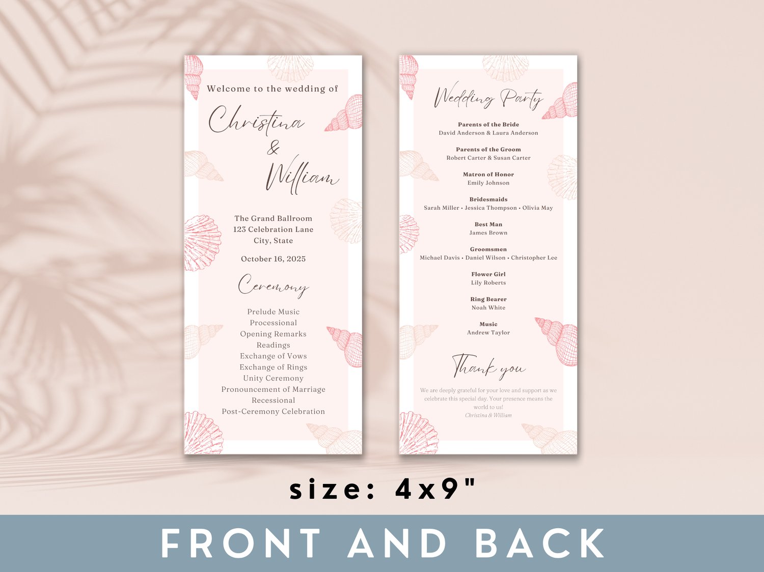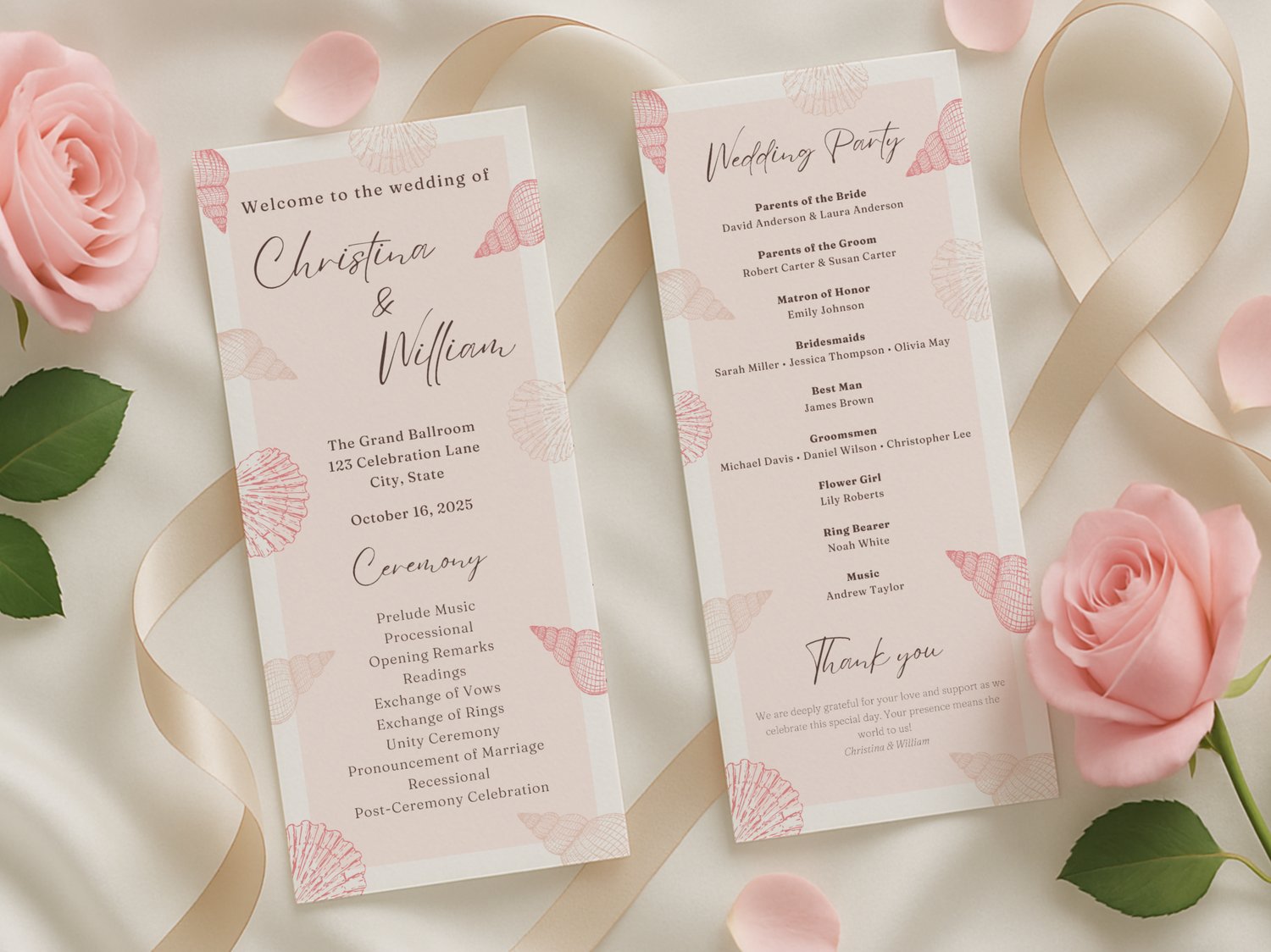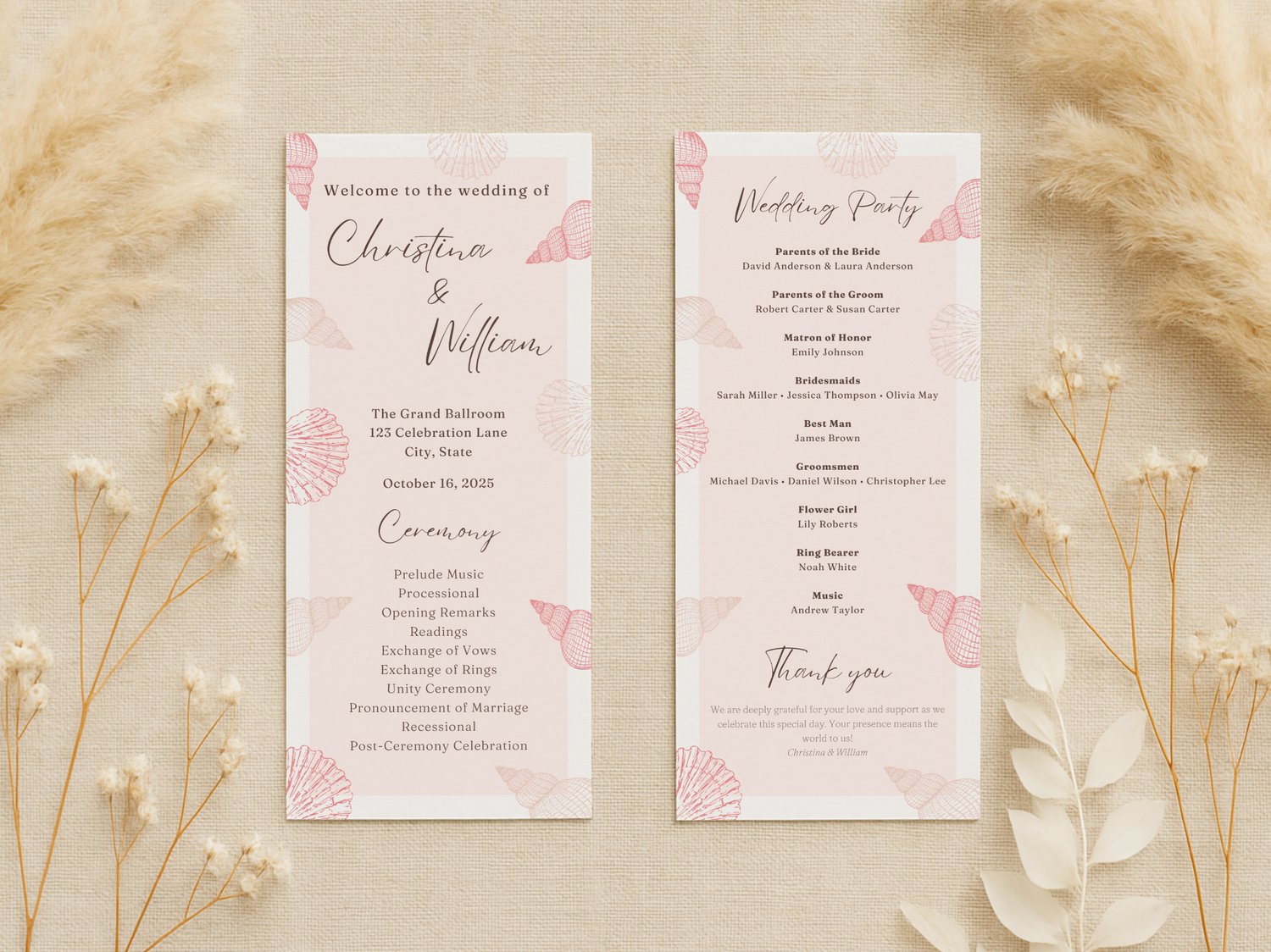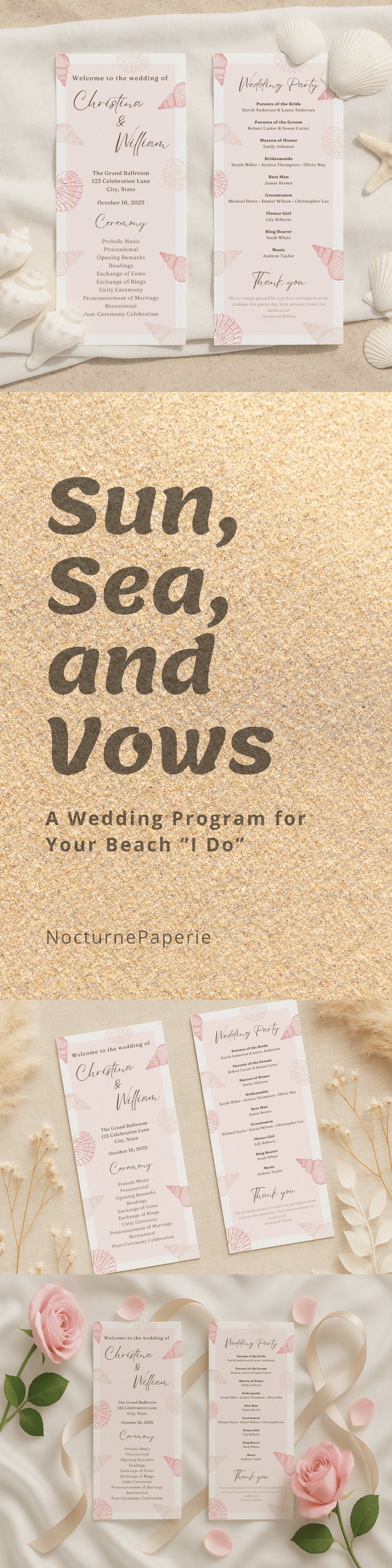 Celebrate your summer coastal wedding with this beach-themed program template in a charming pink palette. This editable and printable design creates a beautiful ceremony timeline handout for your seaside celebration. It’s part of our seasonal collection on NocturnePaperie—explore other seasons like Winter, Spring, and Autumn.