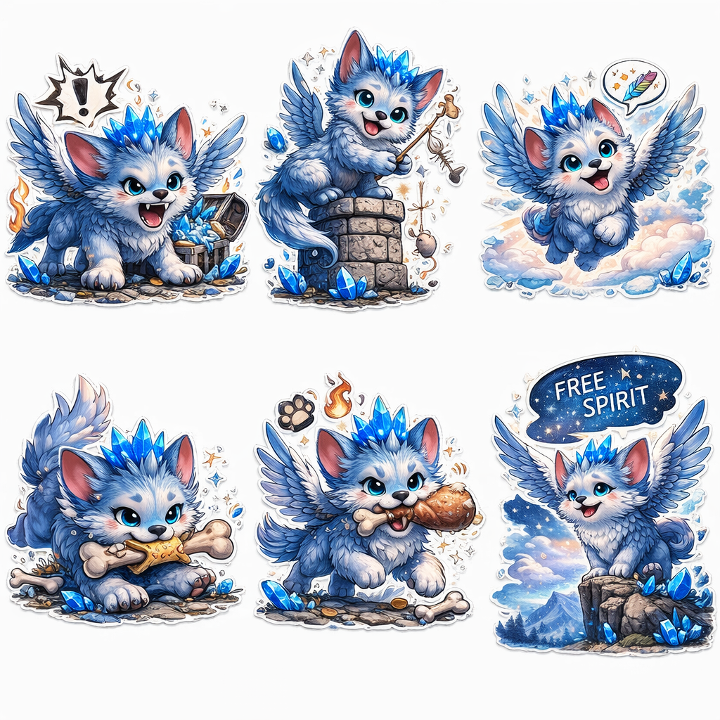 Little Trico Adventures features 6 action-packed stickers of everyone's favourite crystal wolf pup โ finding treasure, building his empire, flying through clouds, guarding his bone, stealing snacks and declaring himself a Free Spirit! ๐ดโโ ๏ธโจ