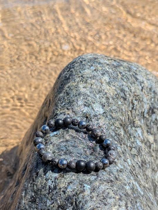 This piece blends dark, powerful stones with mystical flashes of light — symbolising strength anchored in wisdom. Each bracelet is Reiki infused and lovingly grounded by the sea, absorbing the cleansing and stabilising rhythm of ocean energy.