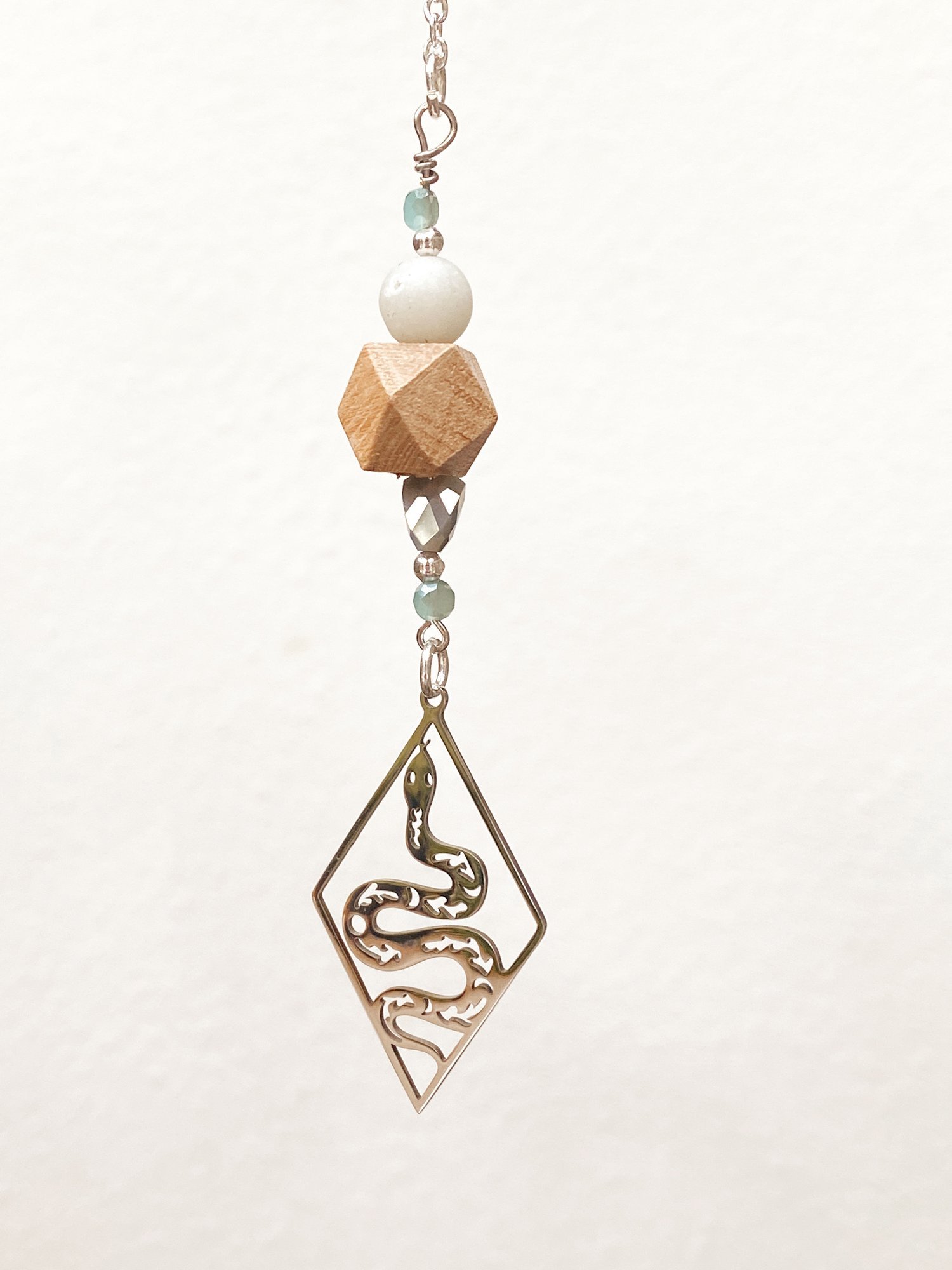 "Transform" Pendulum with wood, amazonite, blue grey crystals in silver with a snake charm.