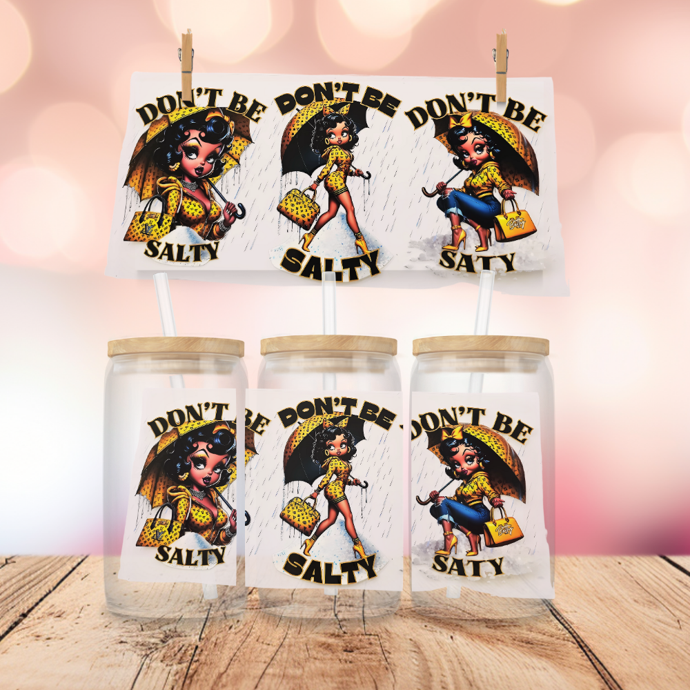 Spice up your sip with some real talk—introducing the Brown Miss B “Don’t Be Salty” Wrap! Designed to fit 16 oz Libbey glass cans or tumblers, this wrap features Miss B serving confident, unbothered energy with bold fashion and a side-eye that says it all. Perfect for the girlies who keep it cute and keep it real.