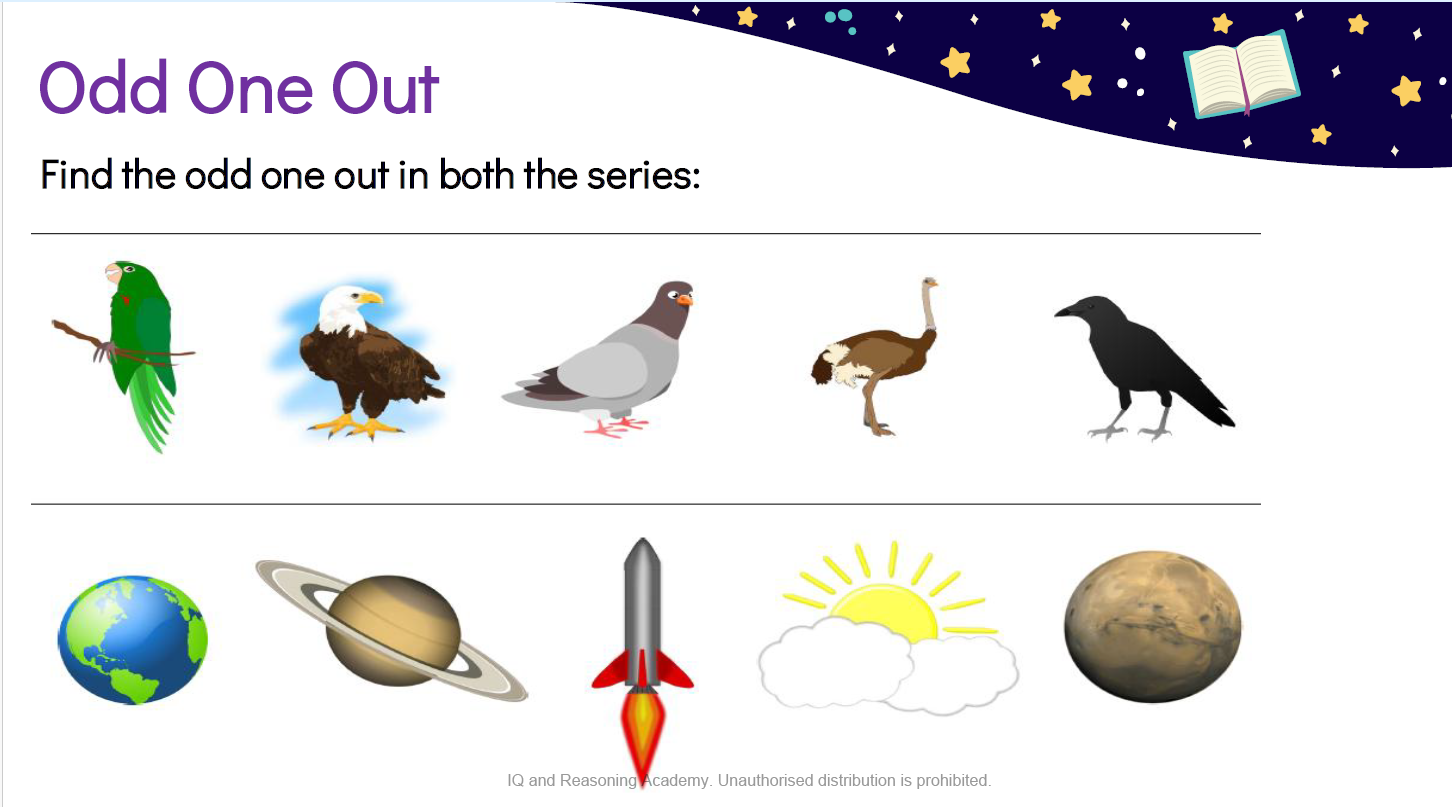 - Logic puzzles, pattern recognition, picture reading, memory games, and word-based challenges