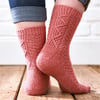 This lace and cable sock pattern is worked toe-up, beginning with Judy’s Magic Cast on and finishing with Elizabeth Zimmerman’s sewn cast-off.