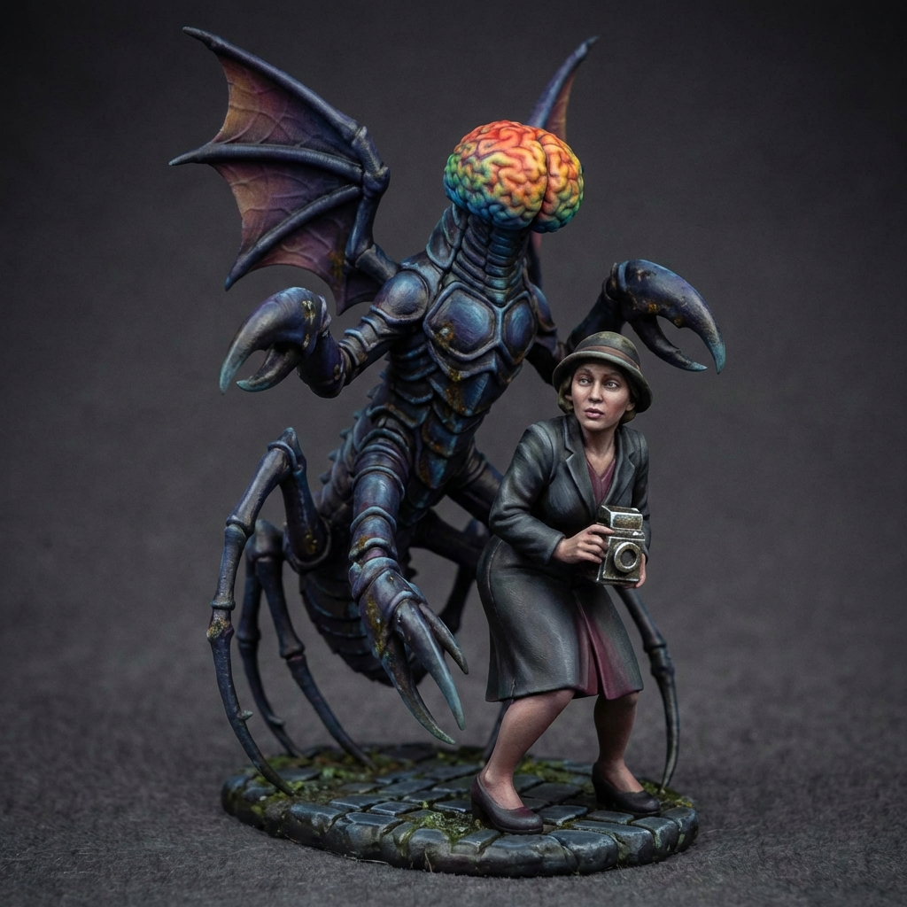 Limbs, claws, and wings are sculpted with solid thickness, avoiding fragile elements while preserving alien complexity. The exposed brain is deeply defined but structurally reinforced for printing.