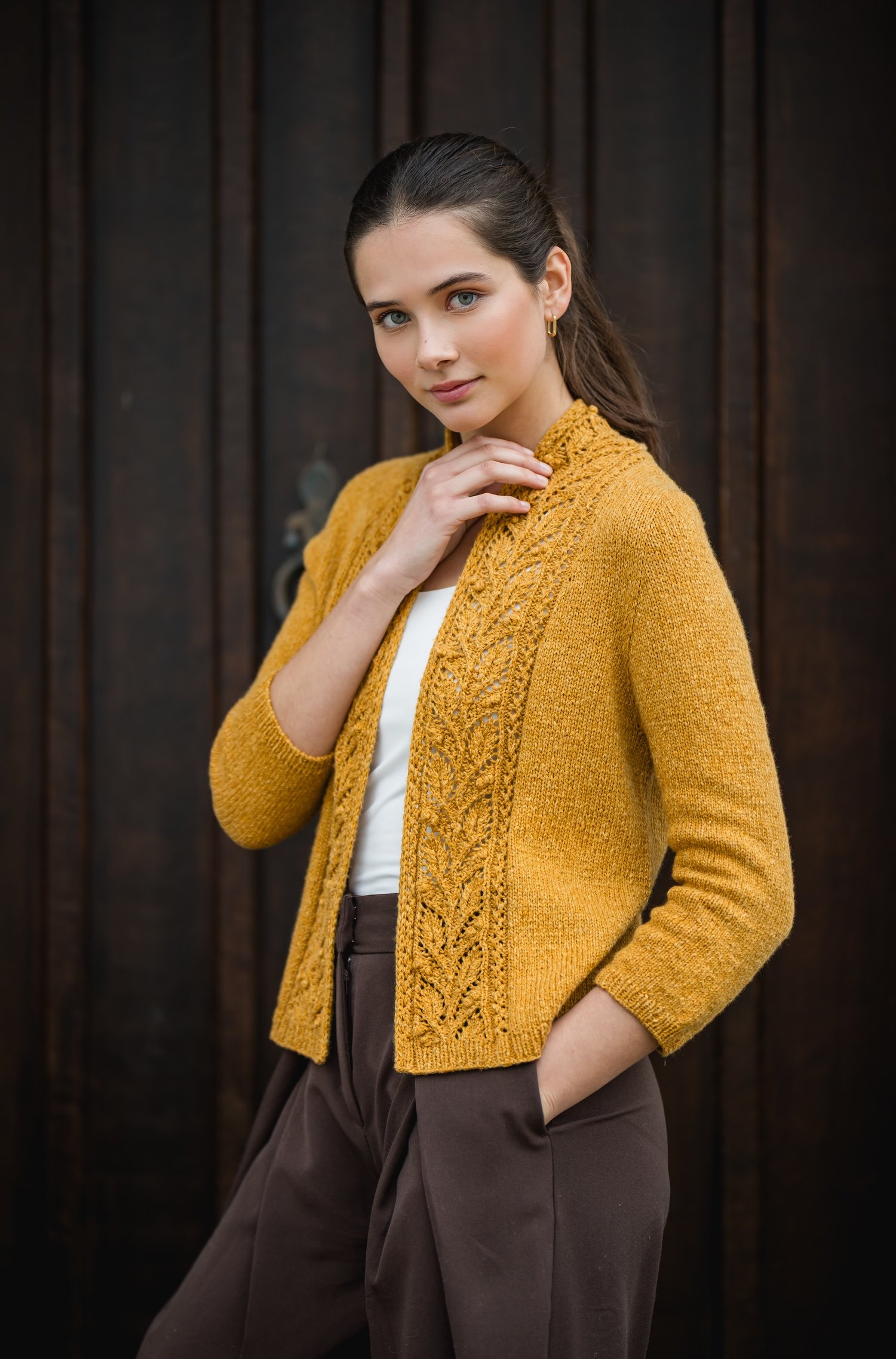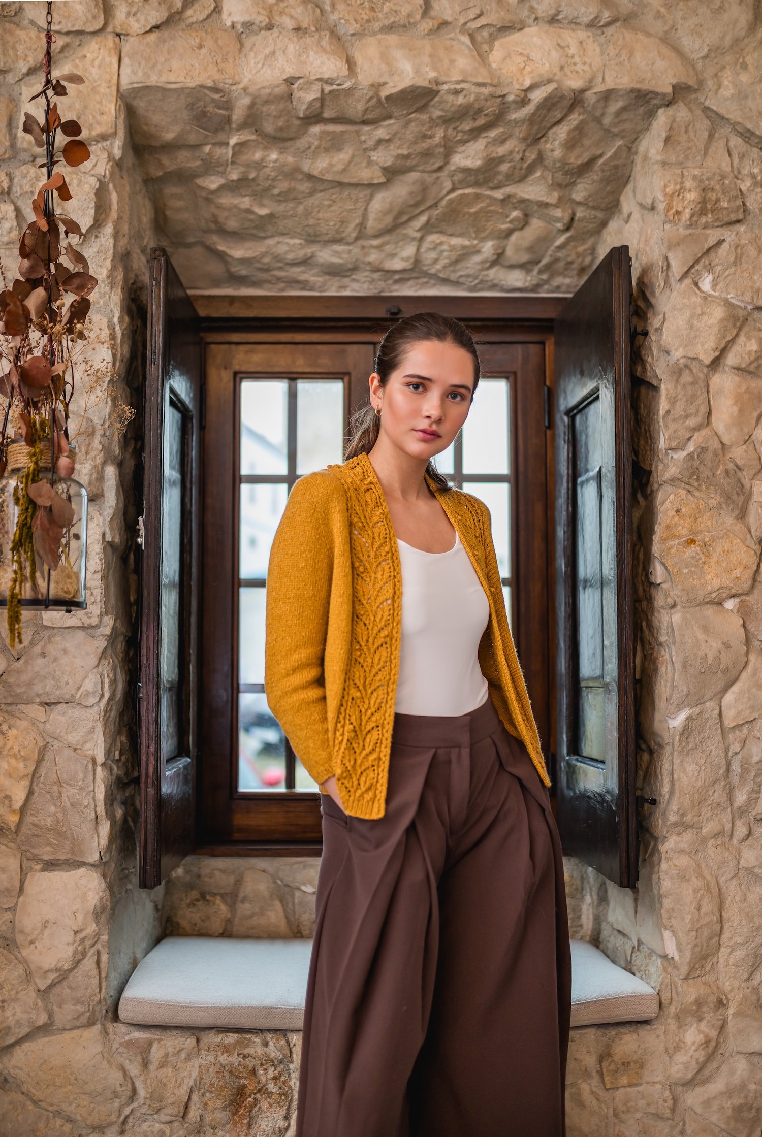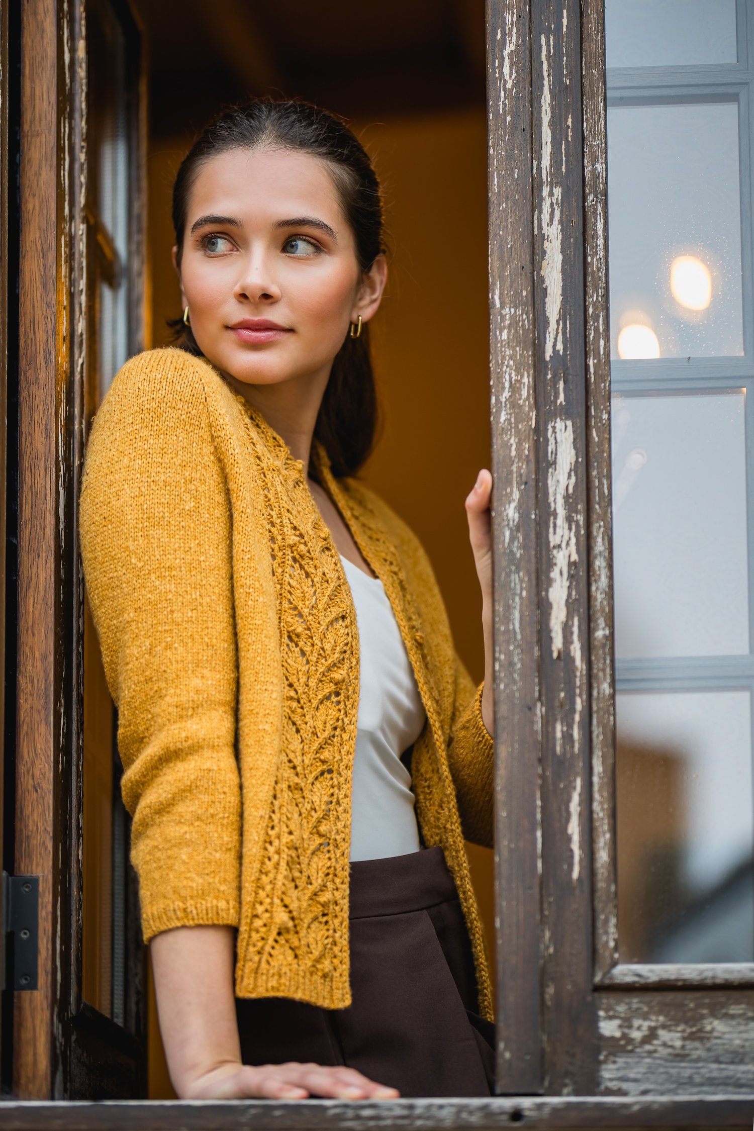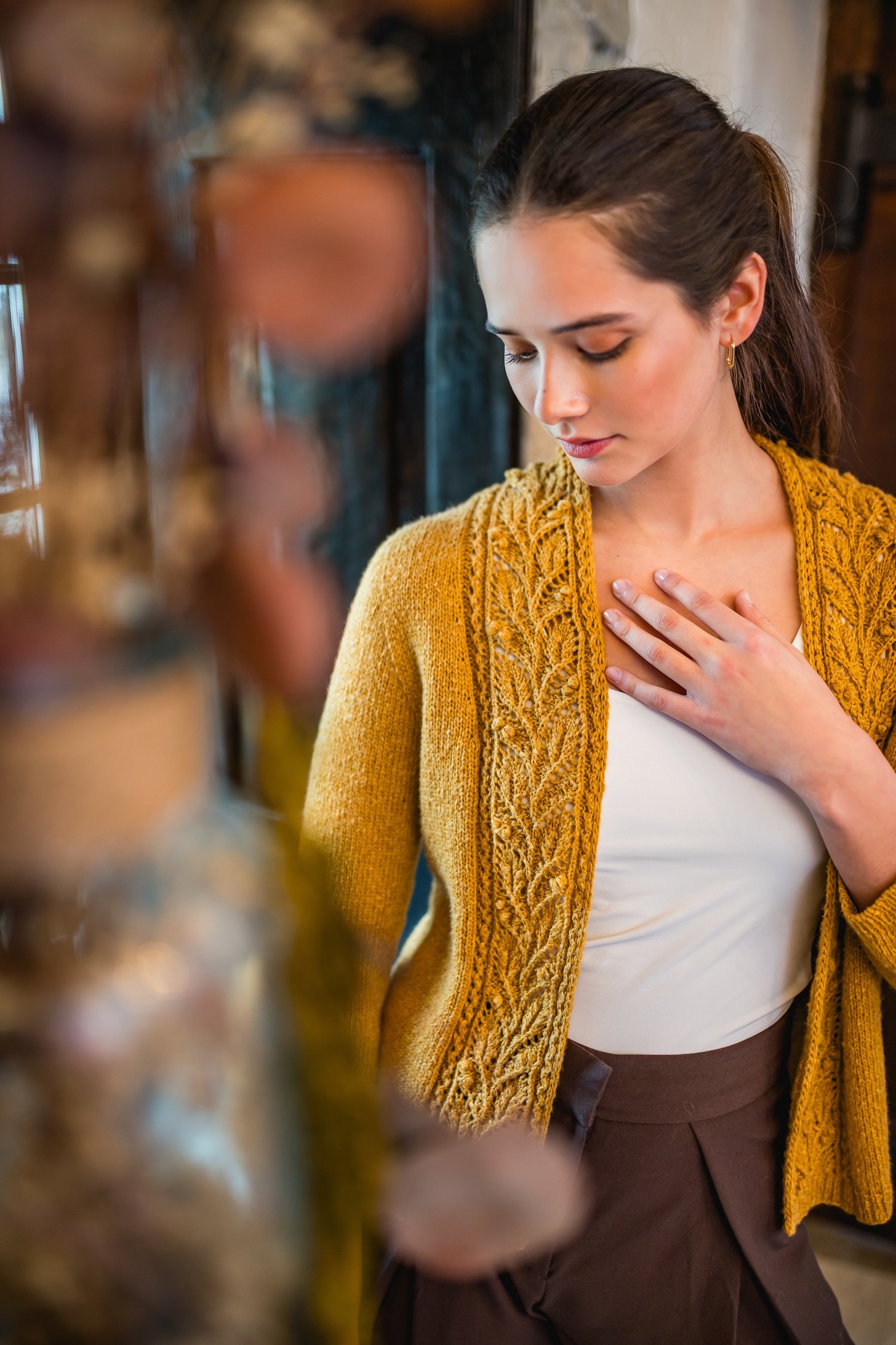 Óbidos Cardigan Inspired by the charm of the traditional village of Óbidos, this delicate cardigan features a lace hem with leaves and small berries, reminiscent of the climbing plants that adorn its façades. Knitted in [Seasons by Heritage] yarn, the perfect balance between wool and cotton results in a lightweight piece that is a true joy to knit.
