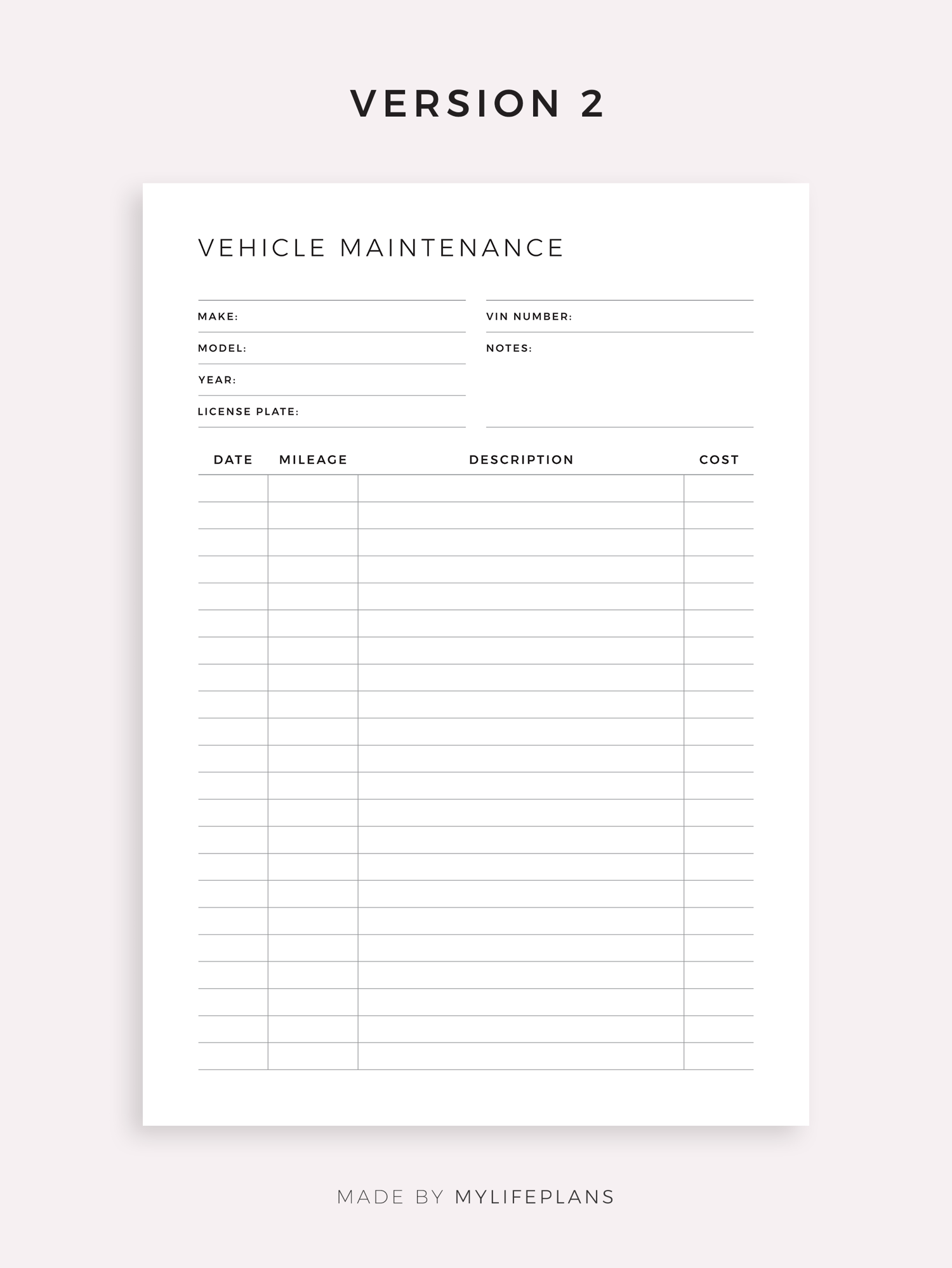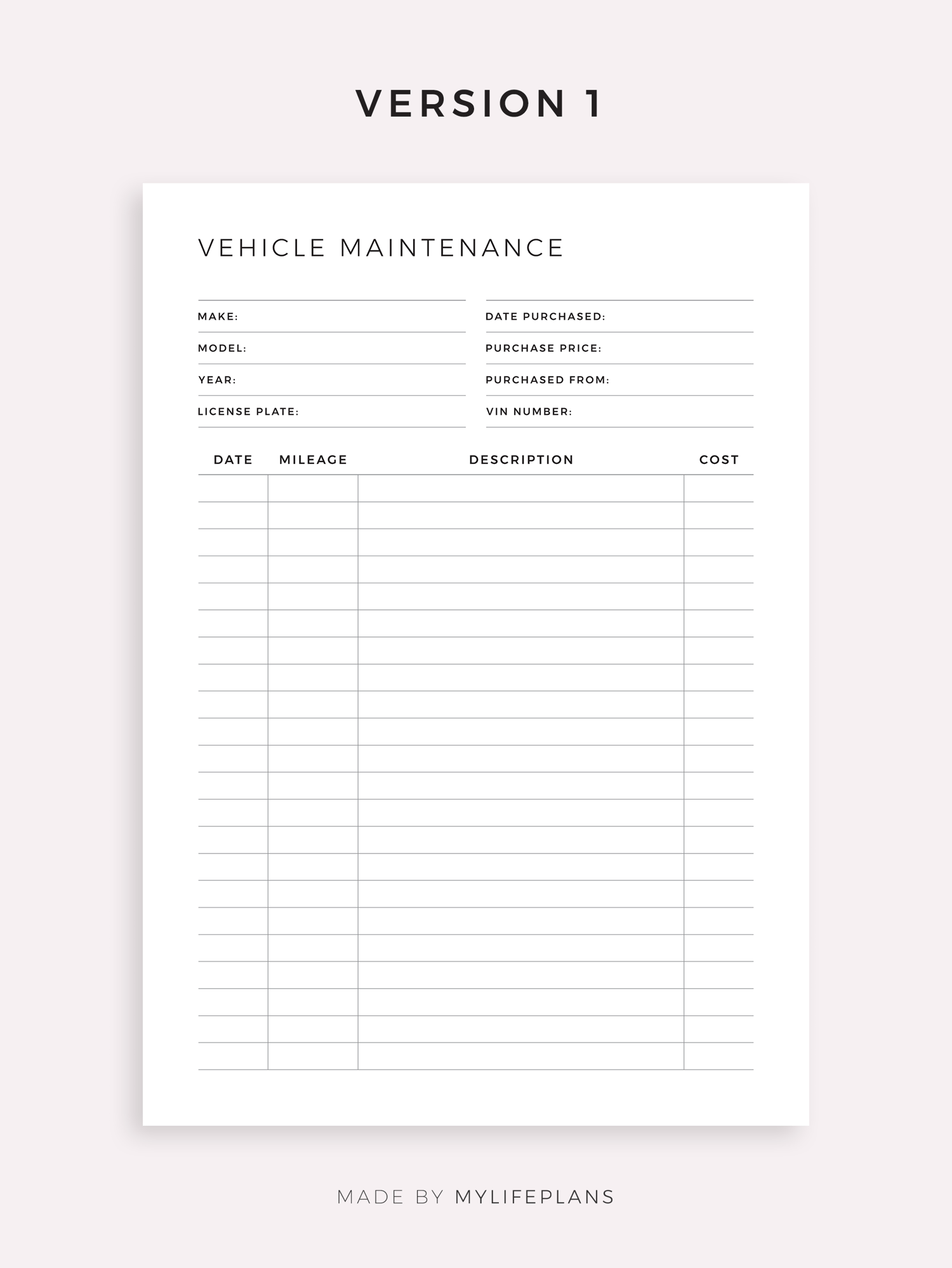 This is a printable vehicle maintenance log book — just download, print, and start using it right away.