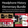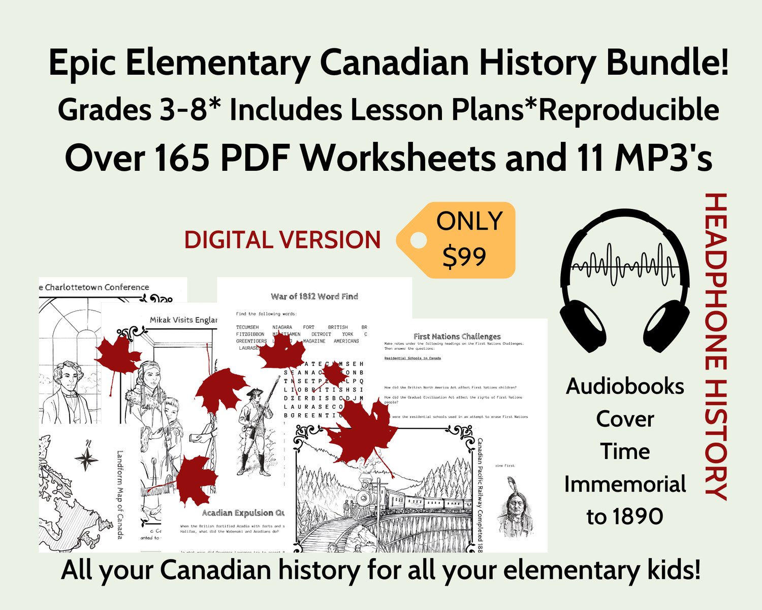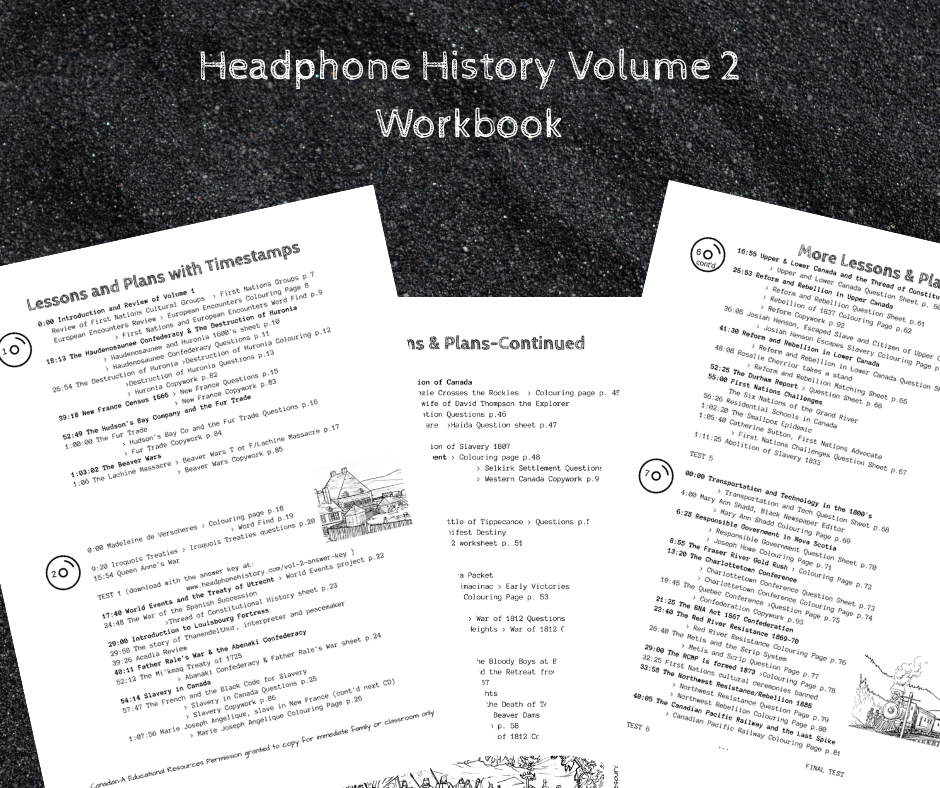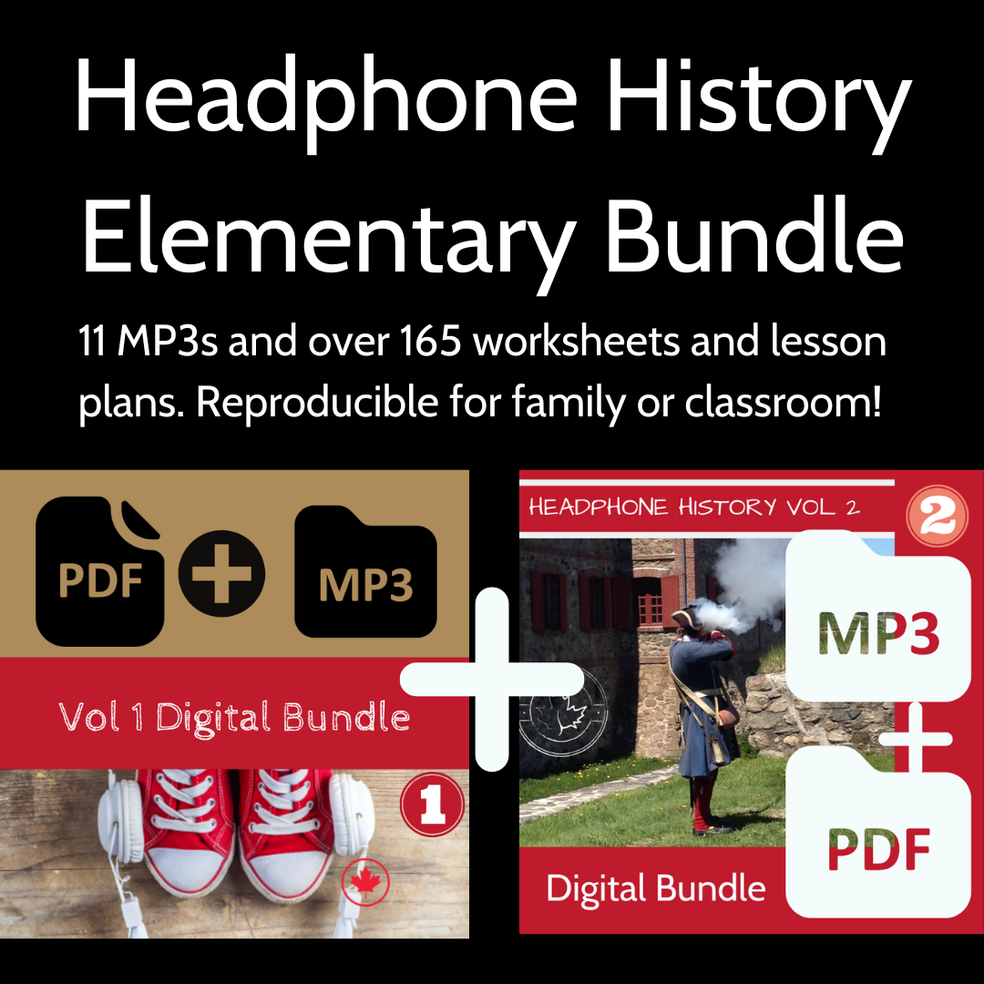 Digital Downloads Headphone History Volumes 1 AND 2 Audiobook MP3's and PDF Workbooks. Save $13 when you buy this bundle. (Volume 1 Audio has the tracks split into individual topics now, so there are far more than 11 MP3's) Workbooks are reproducible for your family or classroom. Canadian History for Grades 3-8, from Time Immemorial to 1885-that's a lot of history!