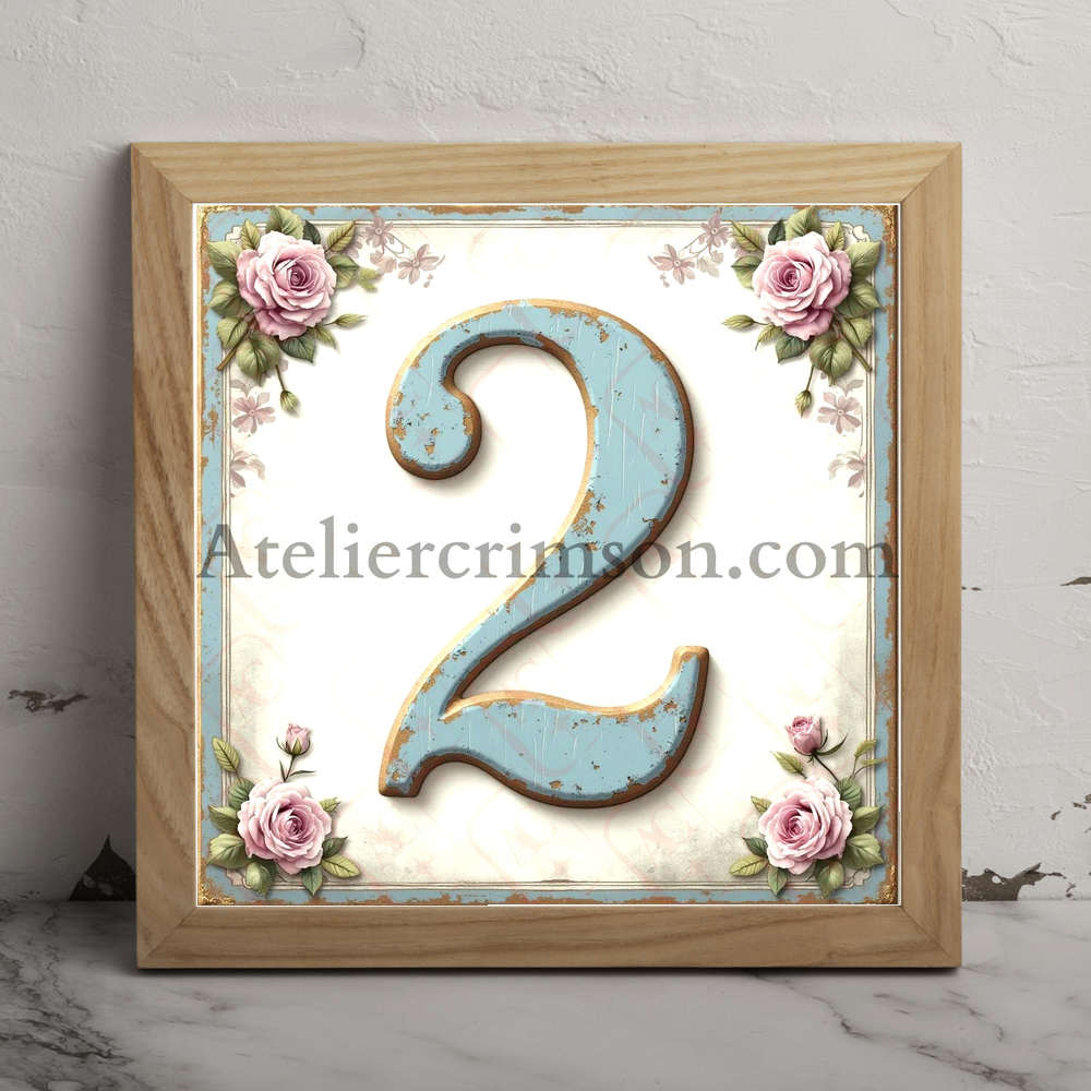 Number 2 shabby chic blue a work of art in soft pastel blue. These elegant characters, reminiscent of weathered painted wood, stand out against a delicate off-white background with subtle floral accents. Perfect for vintage-inspired home decor, DIY projects, or creating unique, personalized gifts with a touch of timeless elegance.