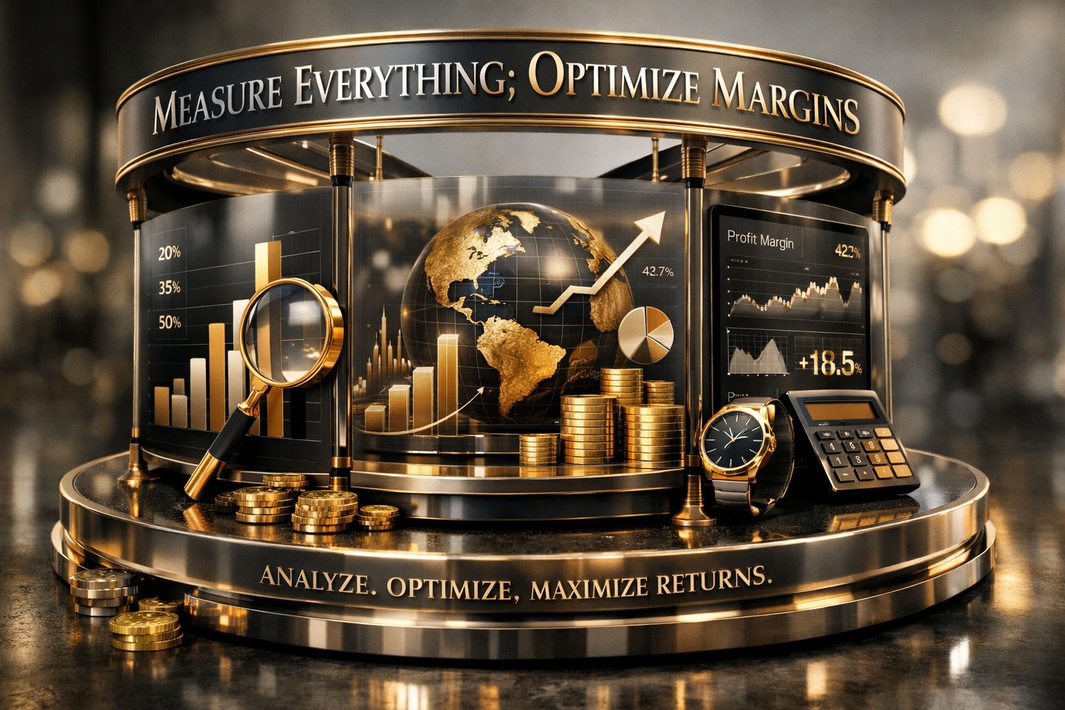 The image is a visual manifesto for precision, performance, and profit discipline. The 3D carousel translates the mindset of elite operators into a museum-grade visual asset—where data, margins, and decision-making are elevated to art. Every element is rendered in photorealistic 3D, combining luxury editorial aesthetics with investment-grade clarity.