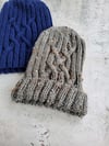 Blue hat sample in size L uses 150m/165 yds Sirdar Cotton Rich Aran in Col. 0003, grey sample in size S with folded brim uses 120 m/130 yds of Caron Simply Soft Tweed in Col. Gray Heather