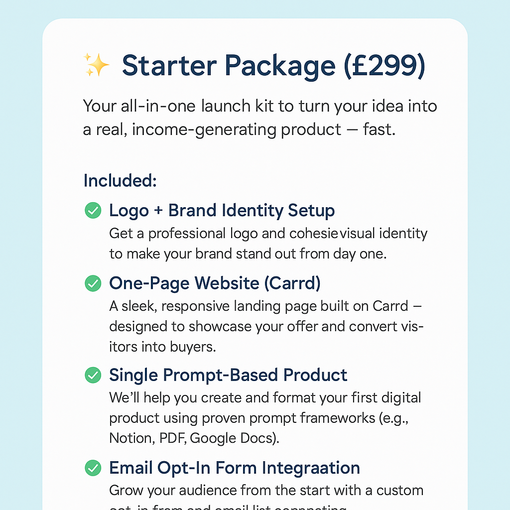 The Starter Package is your all-in-one launch kit to go from idea to income. Ideal for new creators, freelancers, and service providers who want a clean, professional presence without overcomplicating it.
