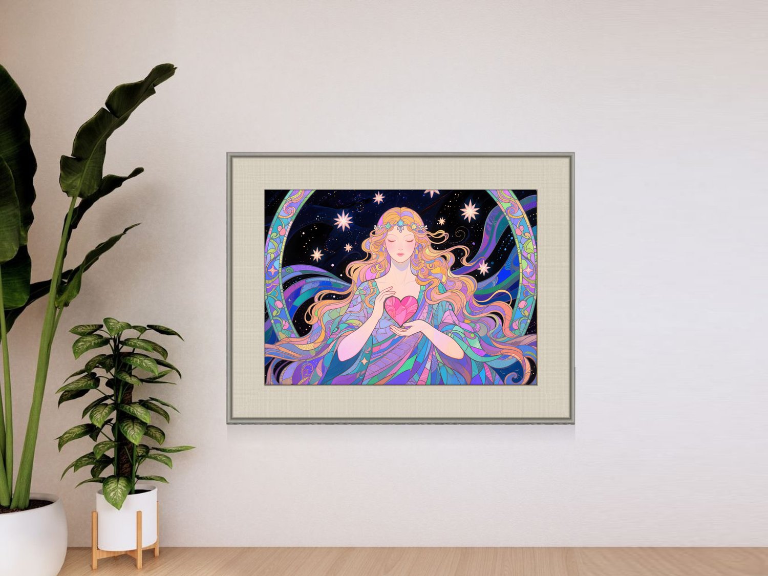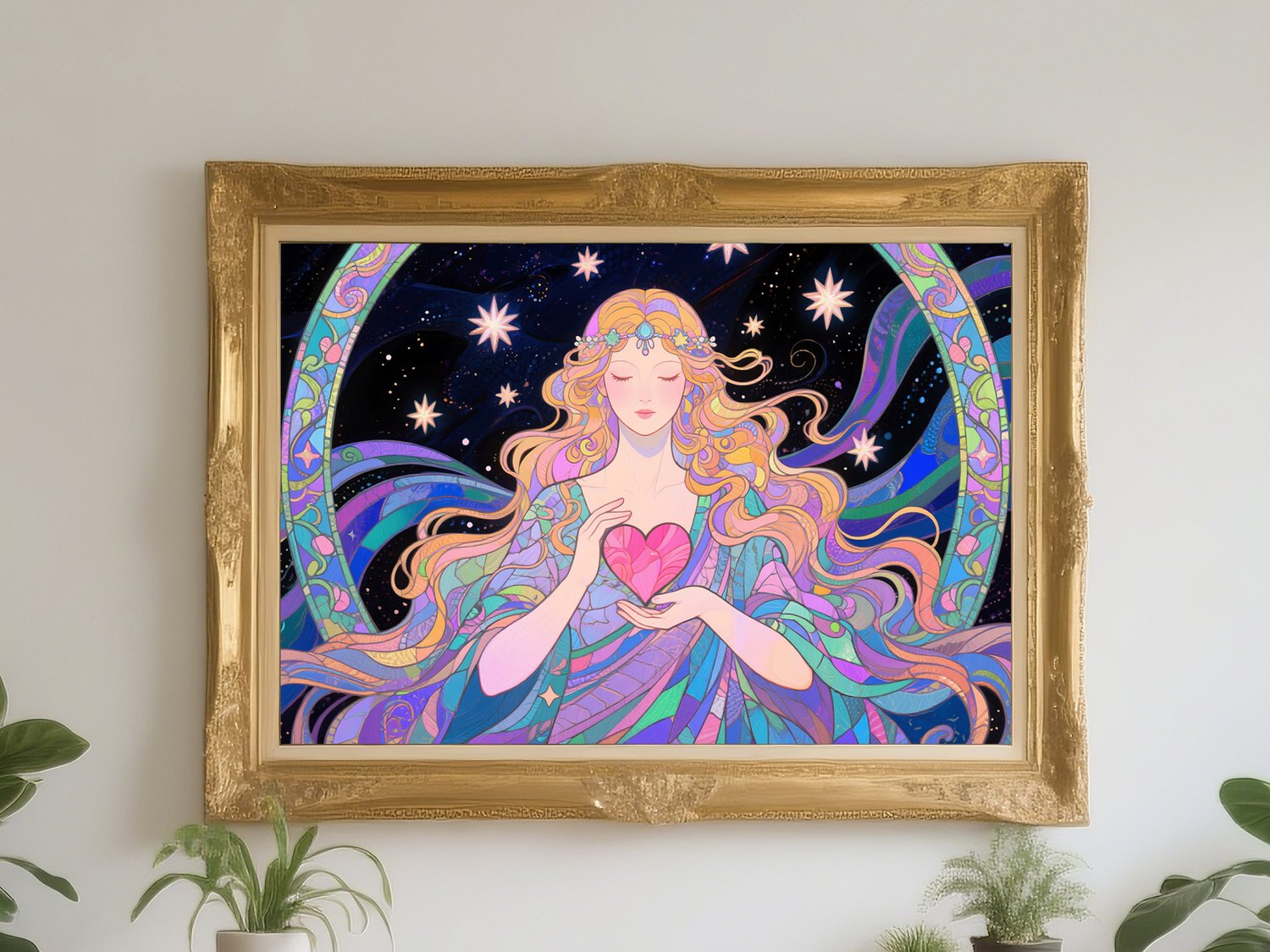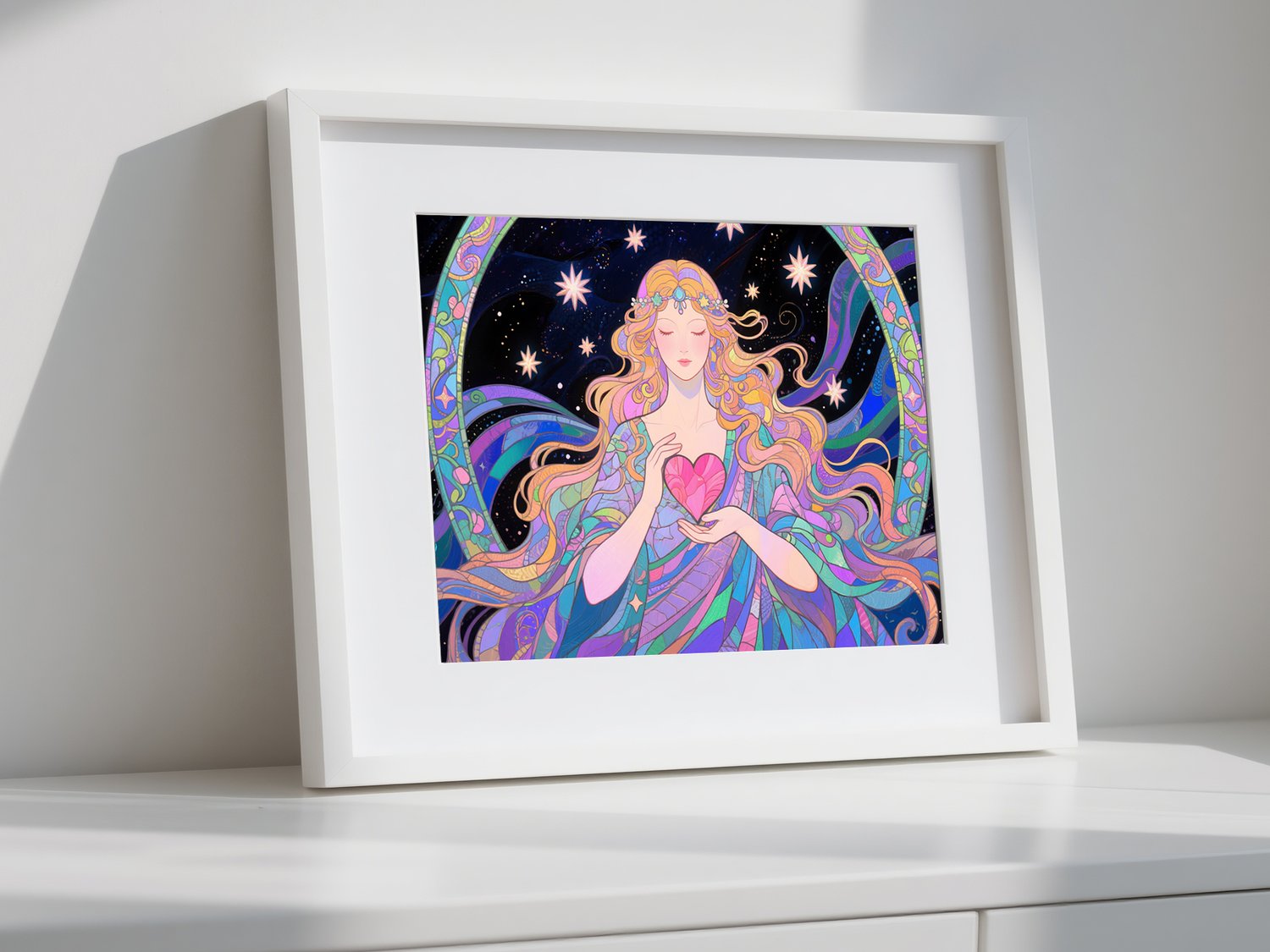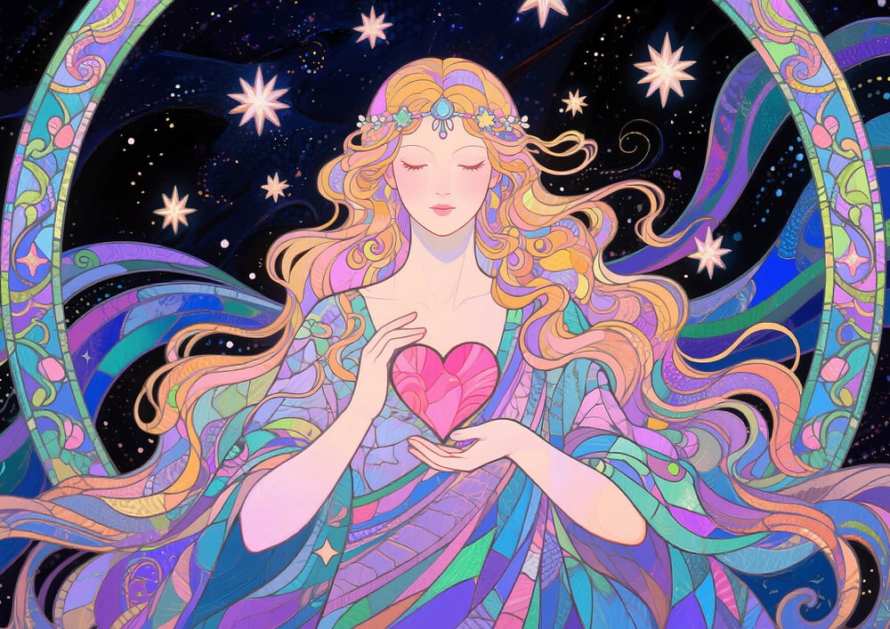 Enhance your romance luck with this magical cosmic art print featuring the goddess of love. With radiant stars, flowing energy, and a heart held in her hands, this artwork channels universal harmony and soulful love. Perfect for bedrooms, meditation spaces, or love-themed decor.