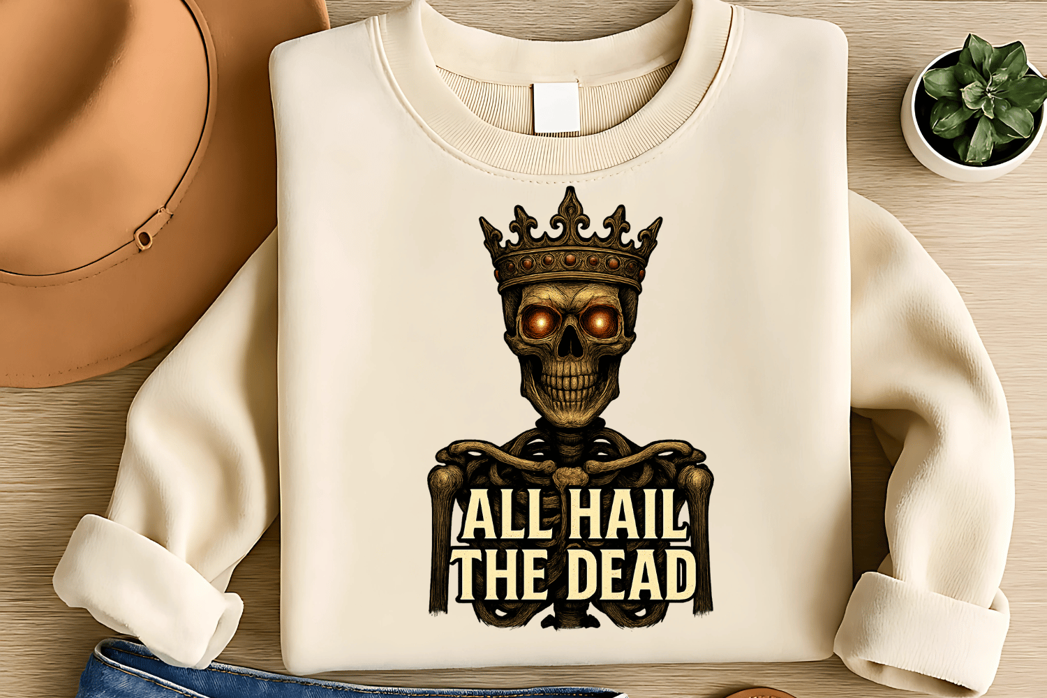 Haunted Crowned Skeleton Sublimation PNG – “All Hail the Dead” Halloween T-Shirt Design – Spooky Royal Theme – 300 DPI Instant Digital Download