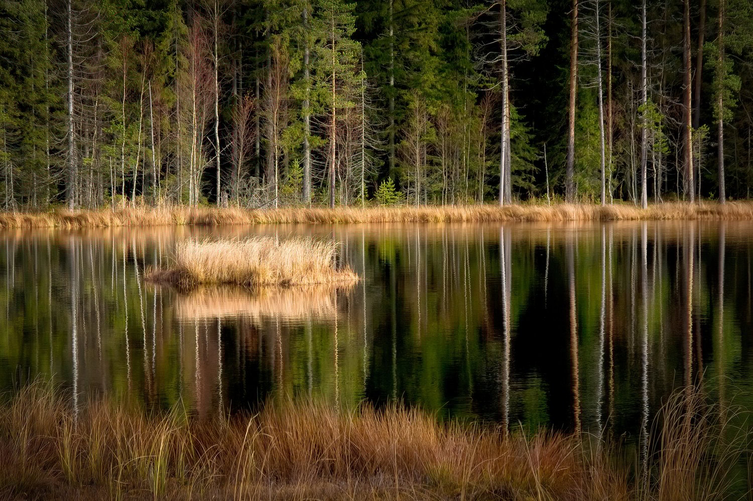Forest pond in October colors. The surface of the pond is like a mirror.