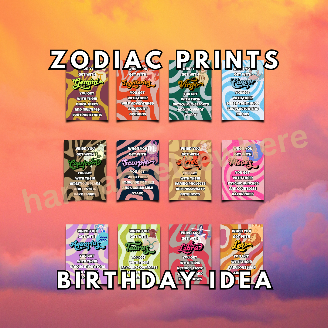 Zodiac prints (all 12) are a magical way to add a unique touch to your home. Print at home, or by using a professional printing service. Printable art is a cost-effective and easy way to decorate your space. Great birthday gift idea! Get all 12 prints for a reduced price.