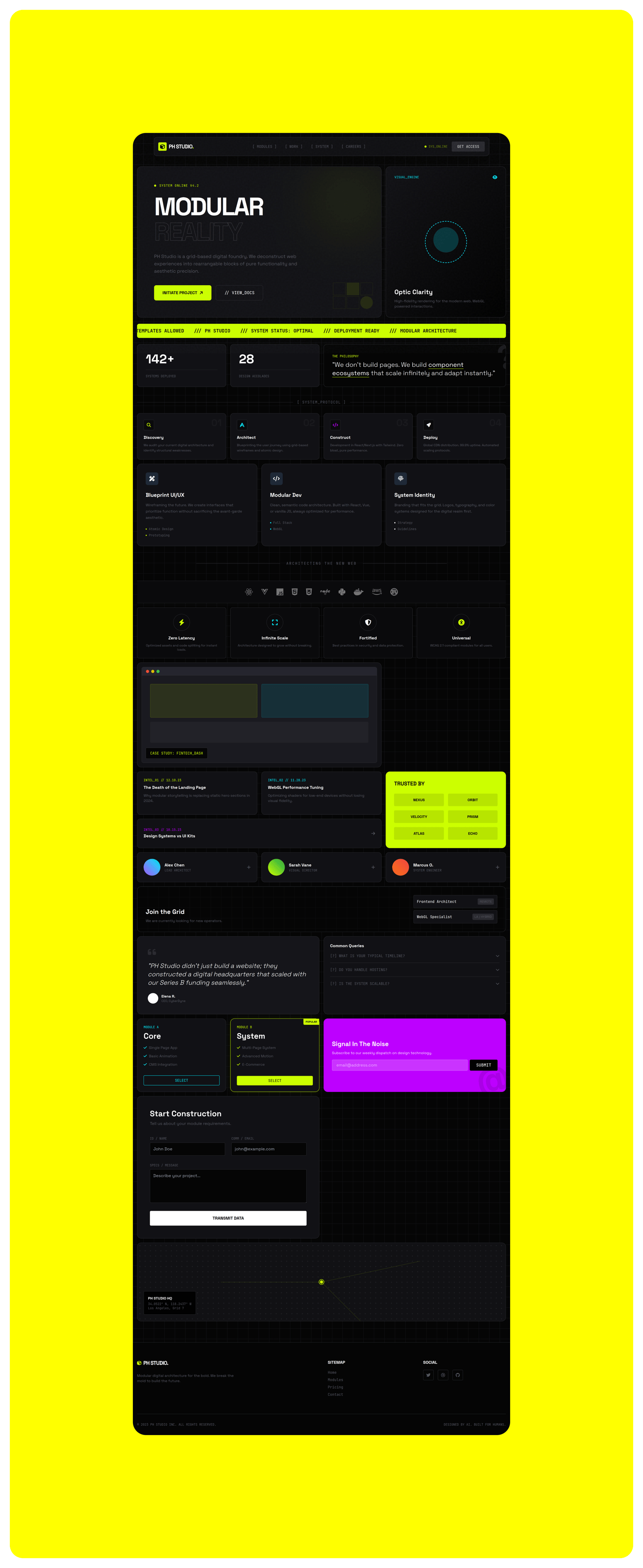A premium, architectural website template with a modular layout, blueprint grid, and neon-accent UX.