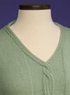 This is an easy cable to work, but the results are stunning! The cable is set off nicely by a panel of Reverse Stockinette stitch, and the cable strands travel easily up the V-neck and around to the center of the back neck, which means minimal neck finishing! Instructions are given for both short or 3/4-length sleeves, but you can work to whatever length you prefer.
