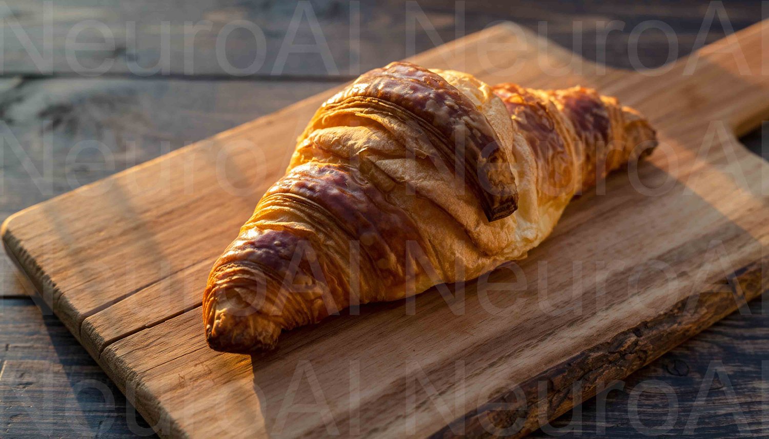 Fresh baked croissant on wooden board at sunrise