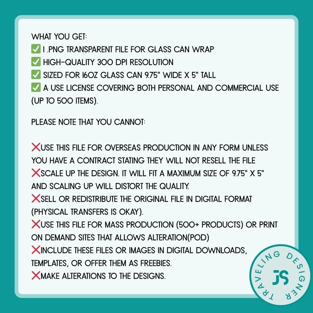 Introducing the perfect solution for creating best-selling custom drinkware! This set includes three distinct, vibrant, seamless patterns designed specifically for 16oz glass can tumblers. Say goodbye to visible seams and hello to professional, all-over prints. Ideal for crafters, Etsy sellers, and sublimation businesses.