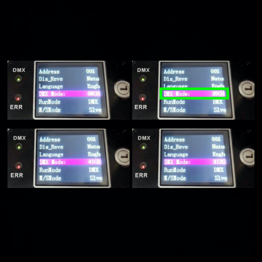 * Verifique, desde el menú del display, que el menu "DMX Mode" muestre los modos dmx: 06CH, 20CH, 41CH y 312C (cuarta foto).