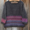 ANNA is a modern take on stranded colorwork, with an open neckline and ¾ length sleeves. The body is worked in the round from the bottom up, then divided at the underarm; the front and back are worked flat to the shoulders. The sleeves are picked up at the armhole edge and worked top down, in the round.