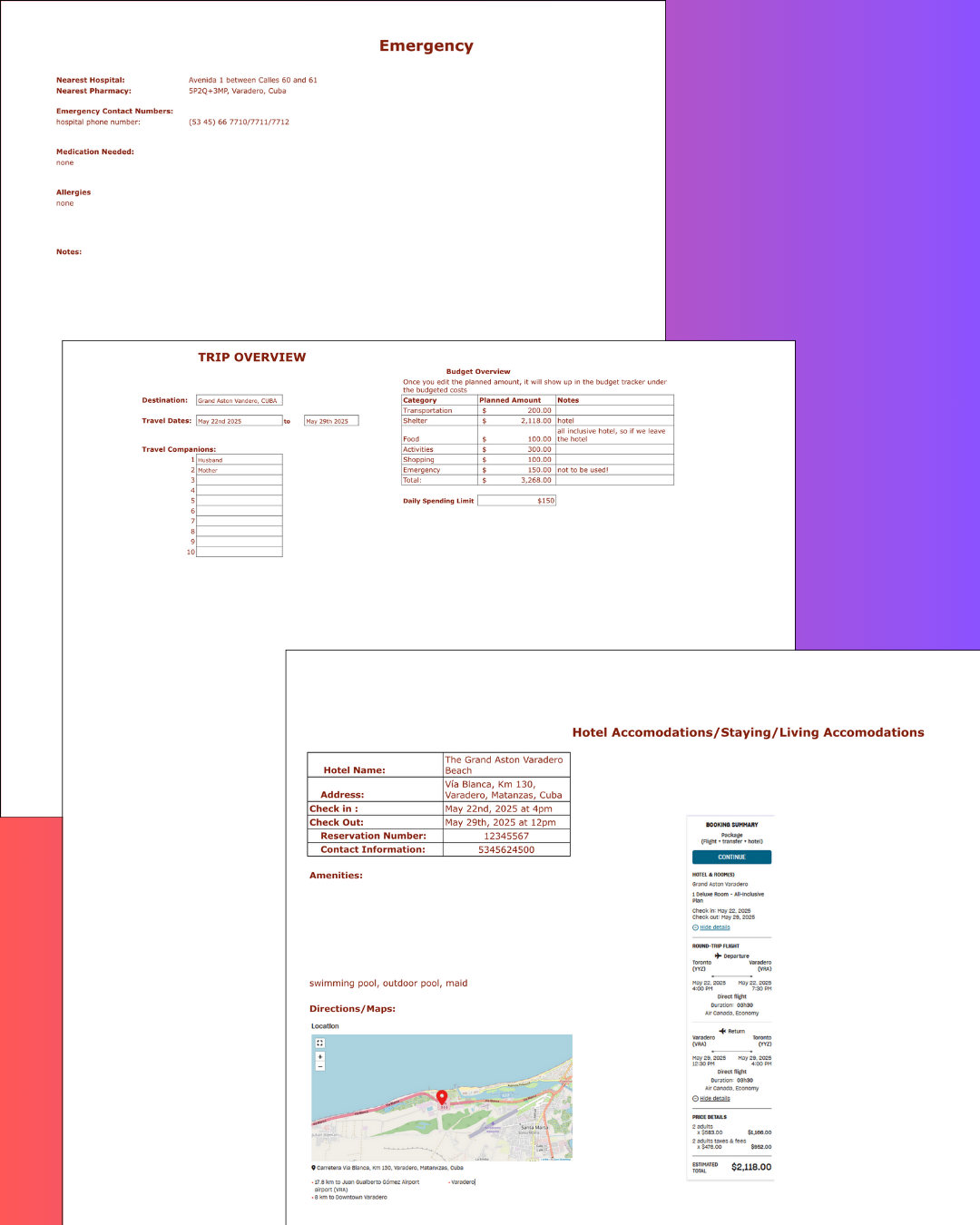 Hotel & Stay Details – Quick access to booking info & addresses that you gather from emails and confirmations before going on the trip