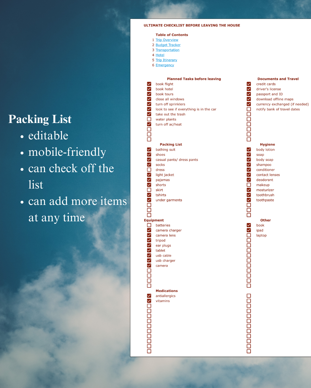 This digital travel planner will help you stay on top of everything from flights to sightseeing! Print it out or use it on your phone/tablet – travel planning has never been easier!