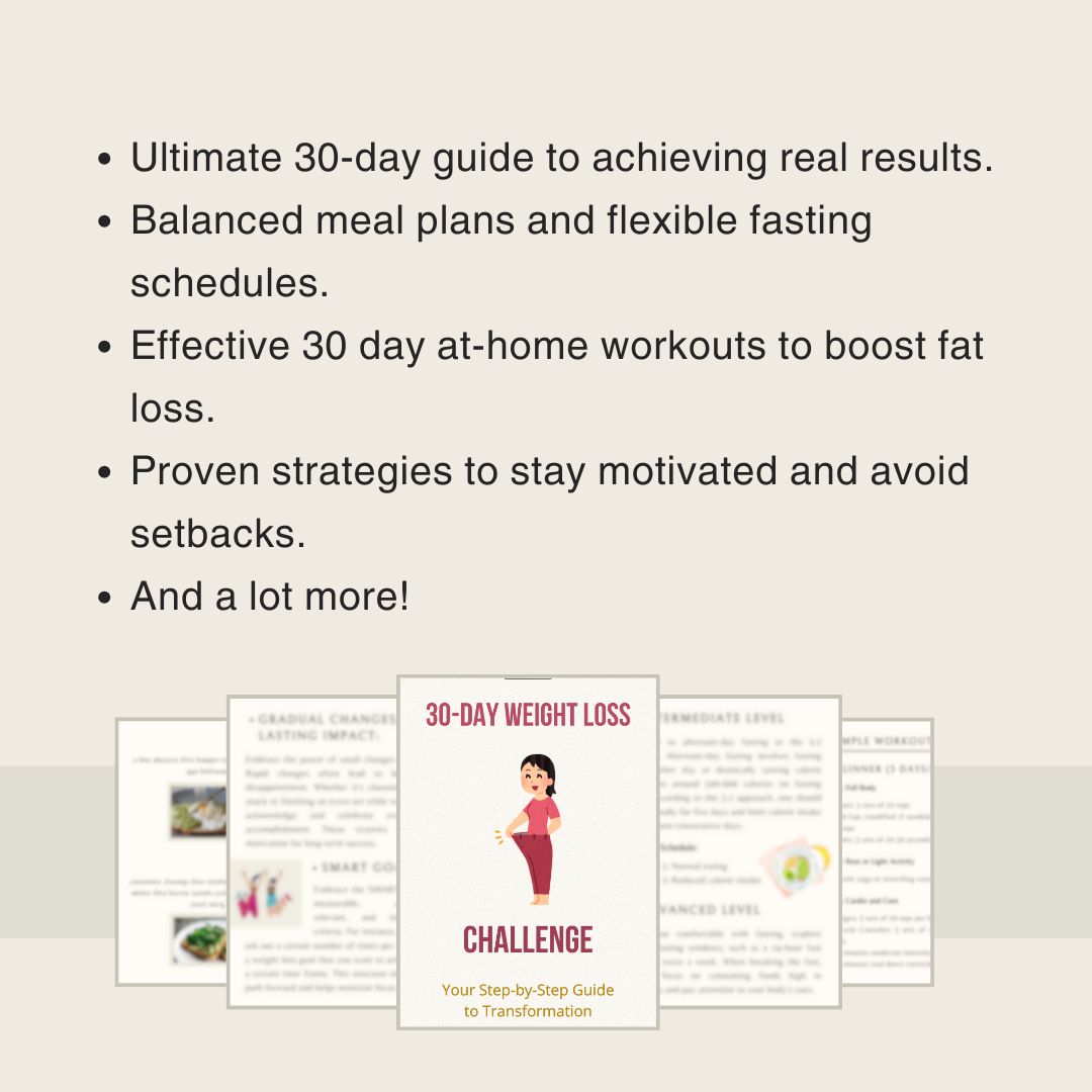 Unveil the ultimate weight loss bundle packed with expert guidance, delicious recipes, and organizational tools. With "30 day weight loss challenge" eBook, "Slim and Healthy" Recipe eBook, and our printable Weight Loss Tracker Journal, success is within reach. Take the first step towards a healthier you now!