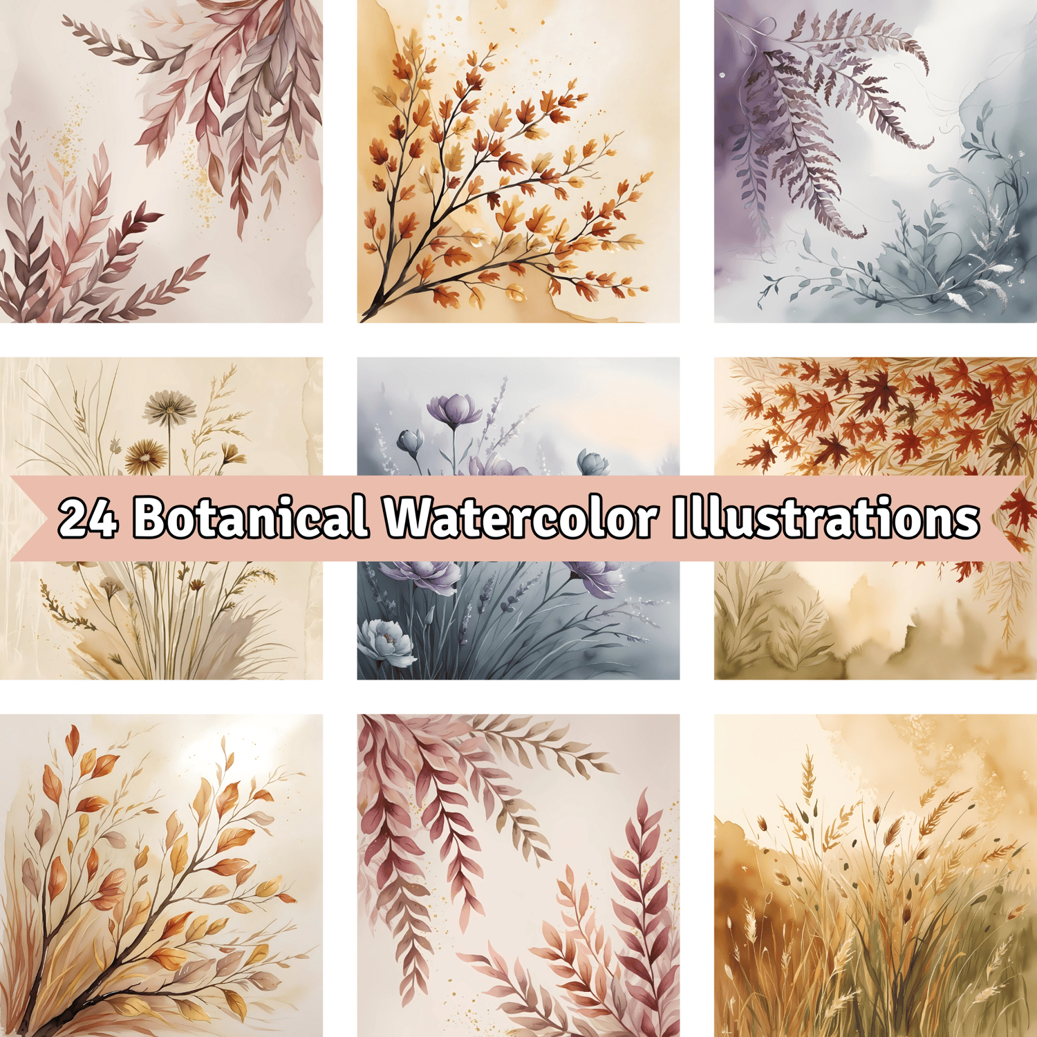 Watercolor Floral & Botanical Illustrations - Set of 24 Designs