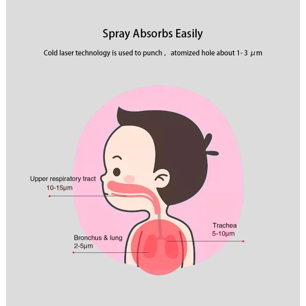 Micron atomized particles make the atomization process as natural as breathing, Direct to the respiratory tract, trachea, alveolus, and lower respiratory tract afflicted part, the liquid is more easily absorbed