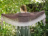 Apou est un châle semi-circulaire orné de perles et de petites pampilles. La première partie est constituée d’un motif mêlant dentelle et torsades. La seconde permet de se reposer après ce dur labeur avec du point mousse !