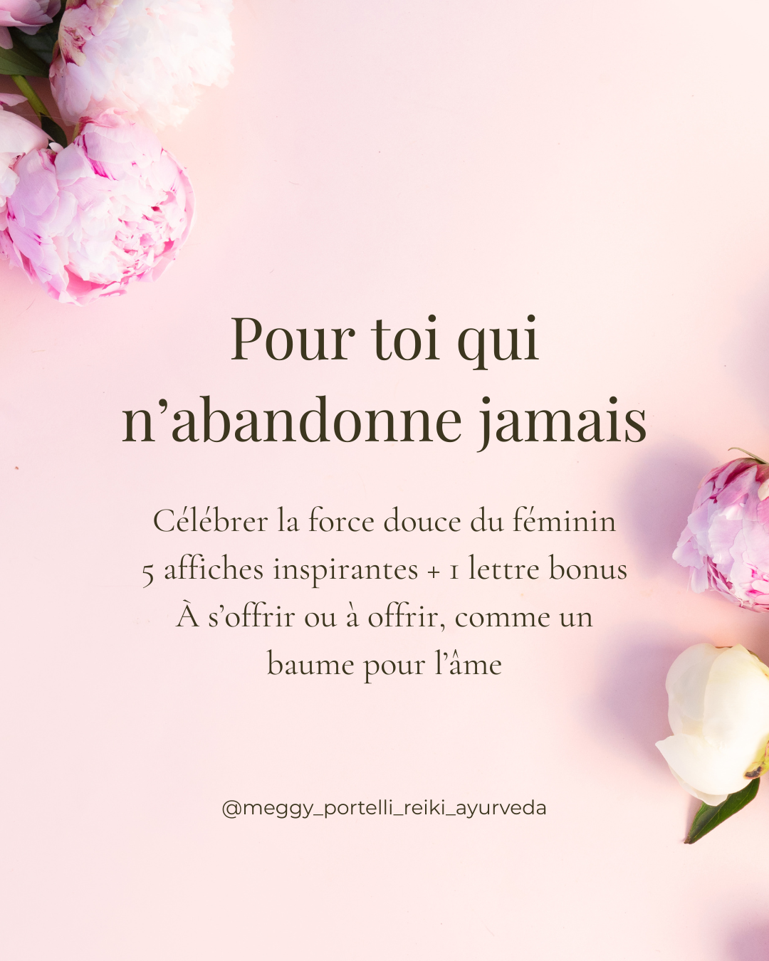 Ce pack unique réunit 5 affiches numériques aux teintes douces, pensées pour soutenir, inspirer et célébrer la force intérieure des femmes, celles qui traversent, qui doutent parfois, mais qui continuent d’avancer, avec courage et tendresse.