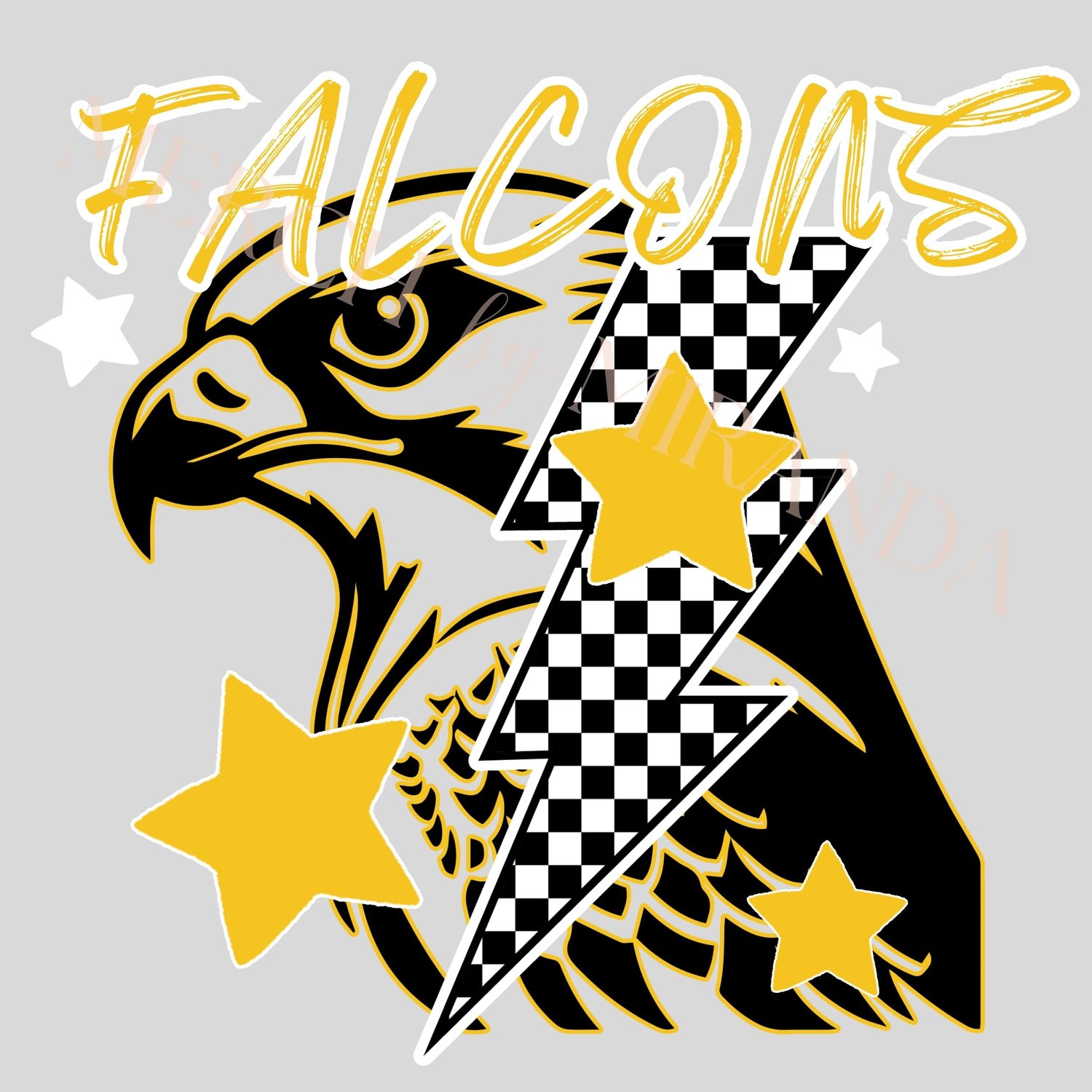 FALCON Mascot Gold | Sublimation Design | Digital Download | School Spirit Shirt PNG | DTF Design | Lightning Bolt-Checkered with Stars - FALCONS
