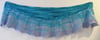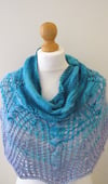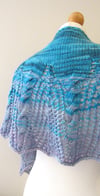 An elongated and shaped crescent shawl with cabled and lace motifs creating a spiralling icicle-inspired design.