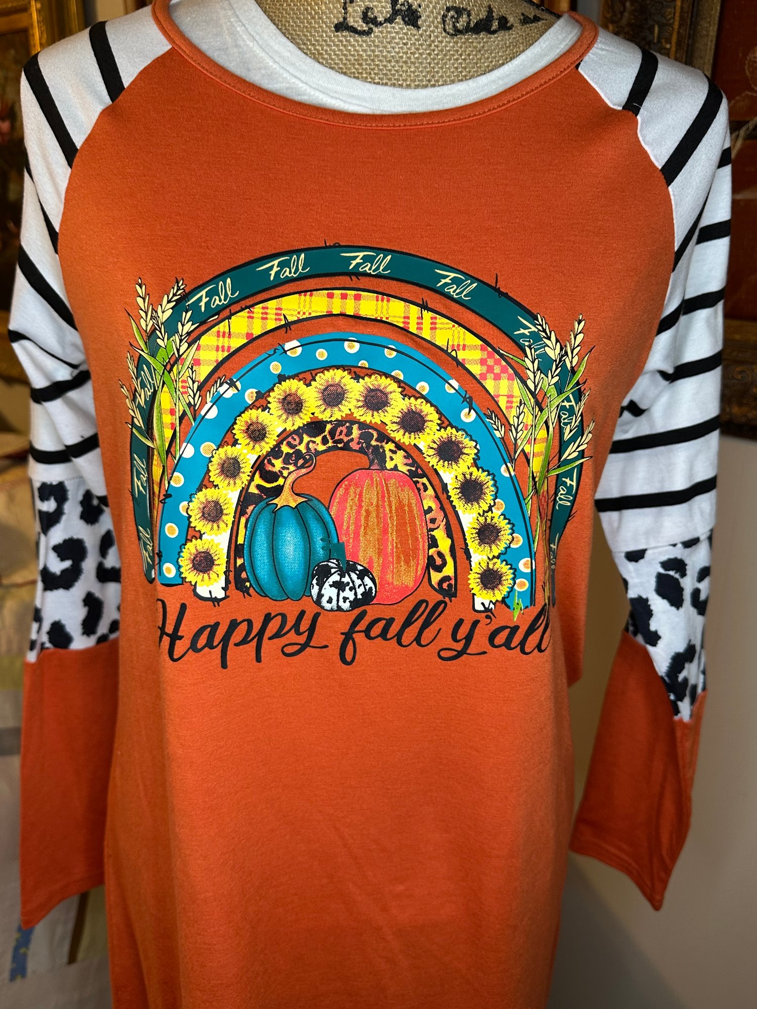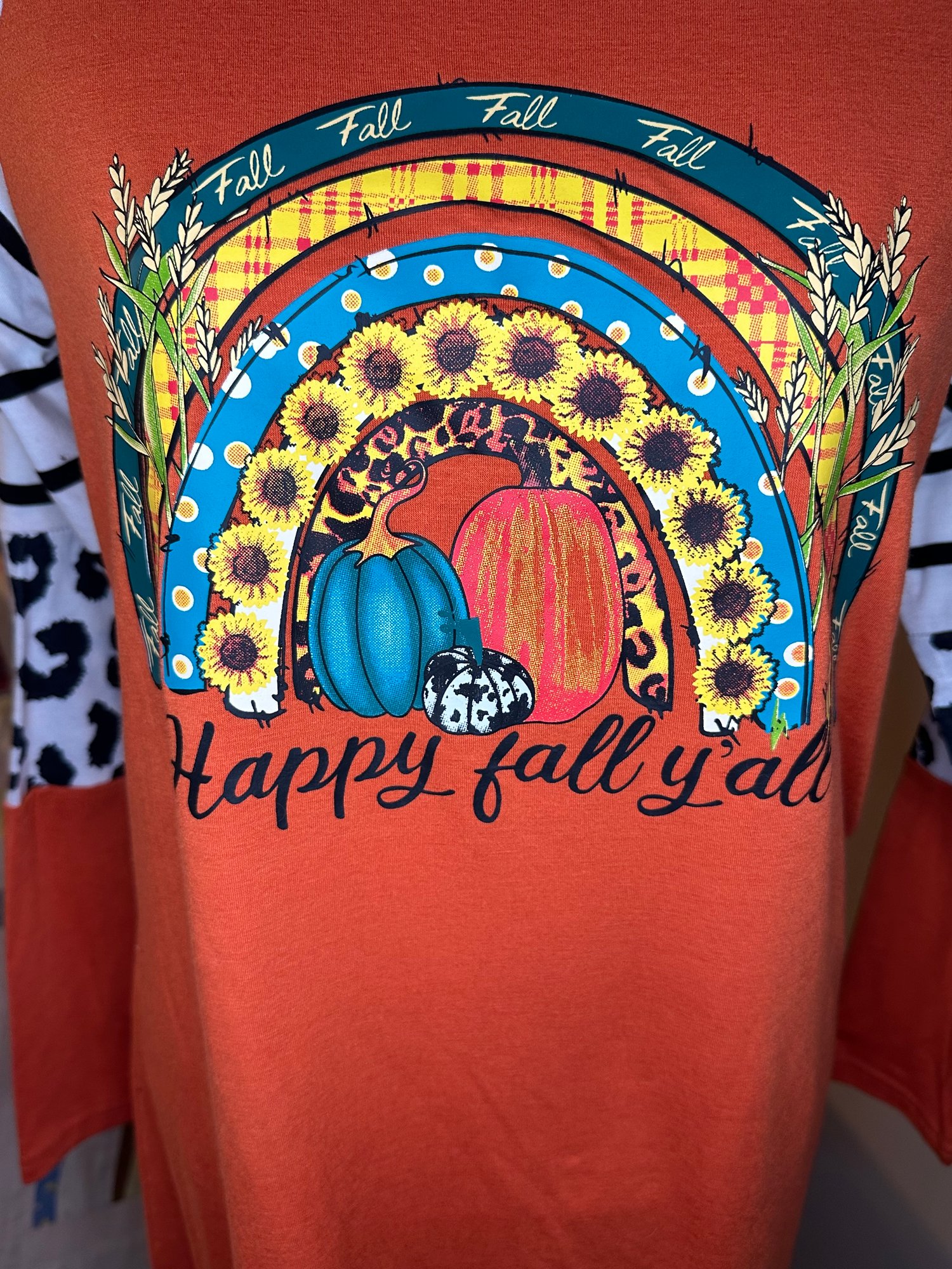 Celebrate the season in style with this playful fall graphic tunic! Featuring a bold orange base with contrasting black-and-white striped and animal print sleeves, this piece is full of personality. The front showcases a colorful rainbow of fall motifs—sunflowers, pumpkins, leopard accents, and the cheerful words “Happy Fall Y’all”—making it the perfect festive outfit for autumn gatherings, pumpkin patch outings, or casual everyday wear.