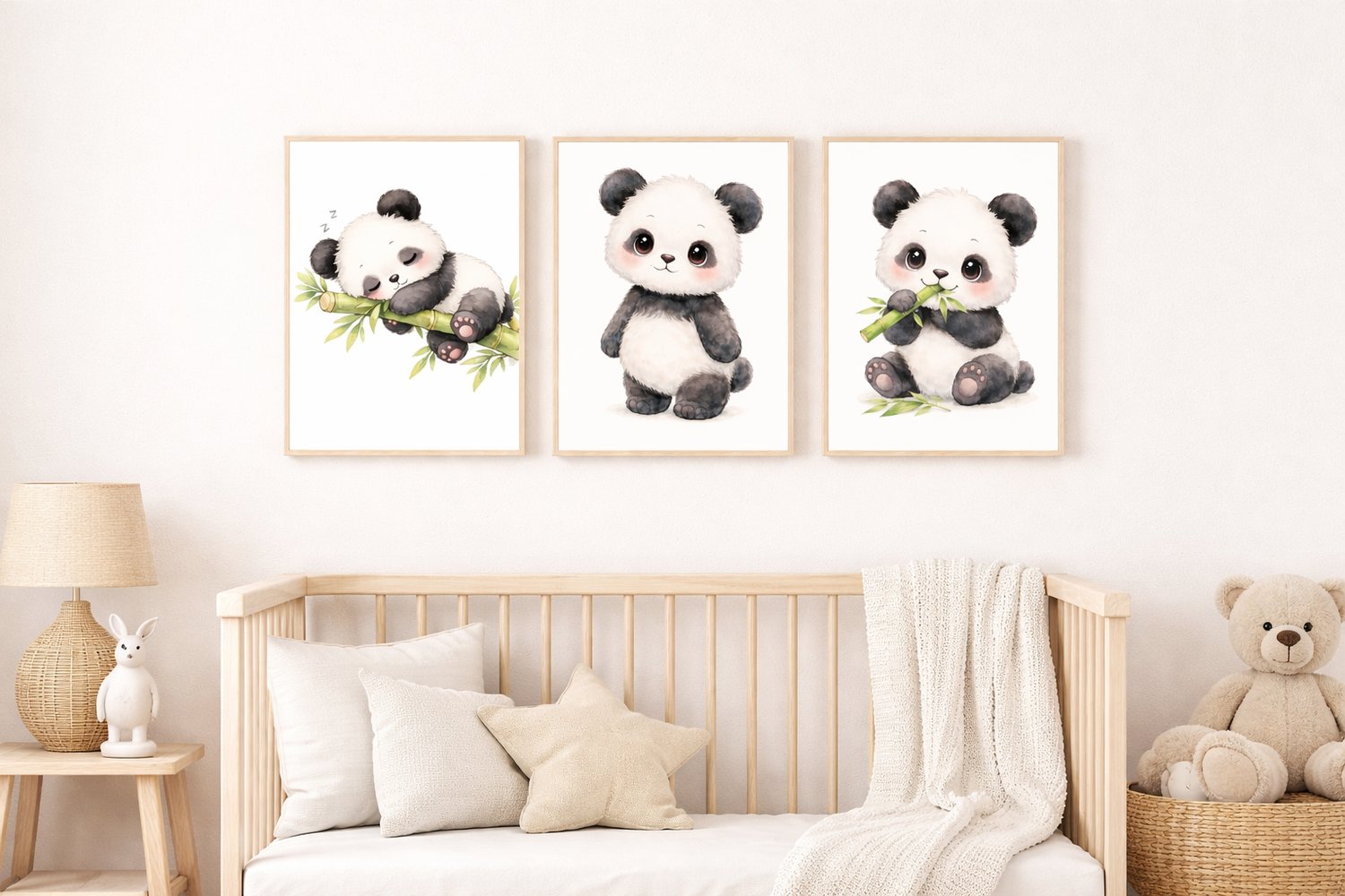 Kawaii Baby Panda Nursery Wall Art Set (3 Prints) | Printable Animal Nursery Decor | Instant Download