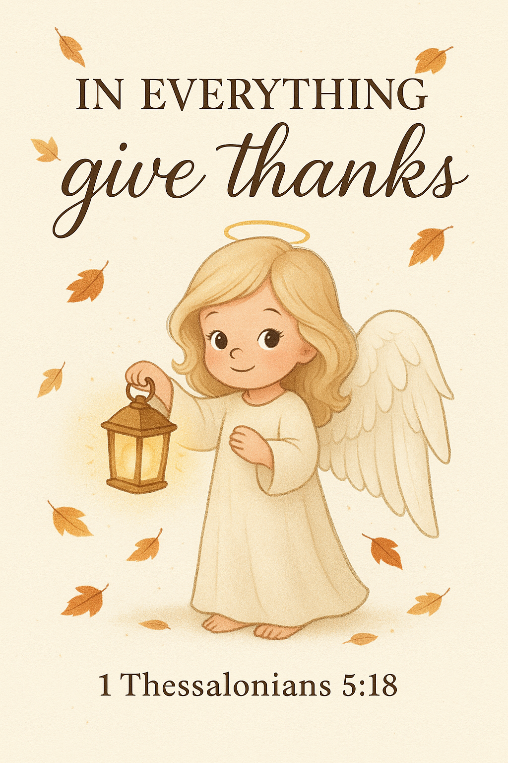 Let gratitude shine with this Autumn Angel Scripture Poster, featuring a smiling angel holding a lantern surrounded by falling leaves. Paired with 1 Thessalonians 5:18, this printable offers warmth, joy, and spiritual encouragement β perfect for childrenβs spaces, ministry kits, or Thanksgiving dΓ©cor.