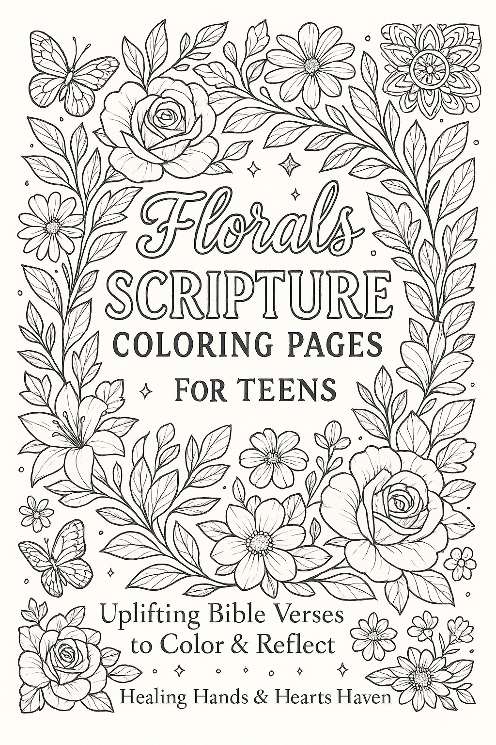 Designed with love by Mizanelle & Allyson at Healing Hands & Hearts Haven, this printable collection includes 15 uplifting Bible verses, each surrounded by elegant floral borders, butterflies, and symbols of hope. Teens can color the scripture text itself, making each page both inspiring and interactive.
