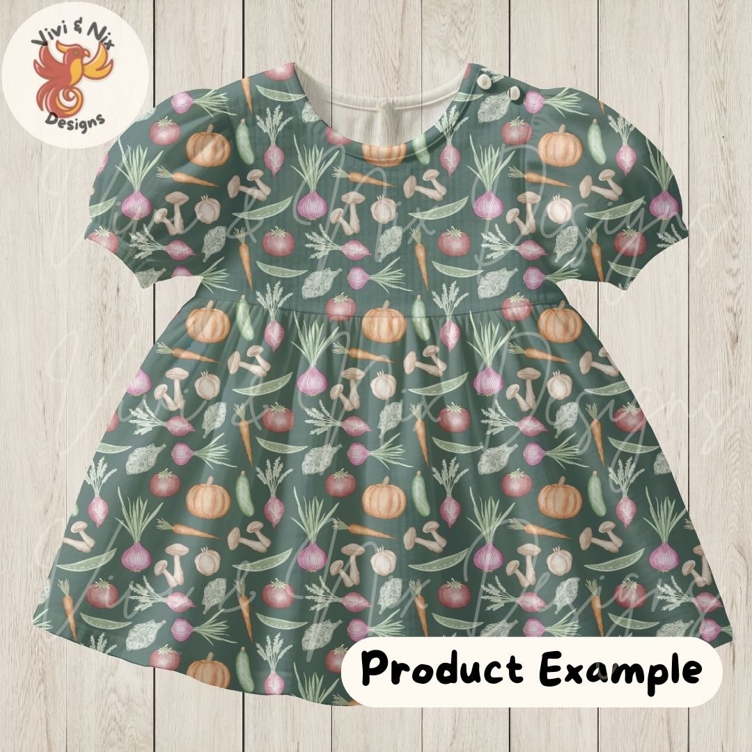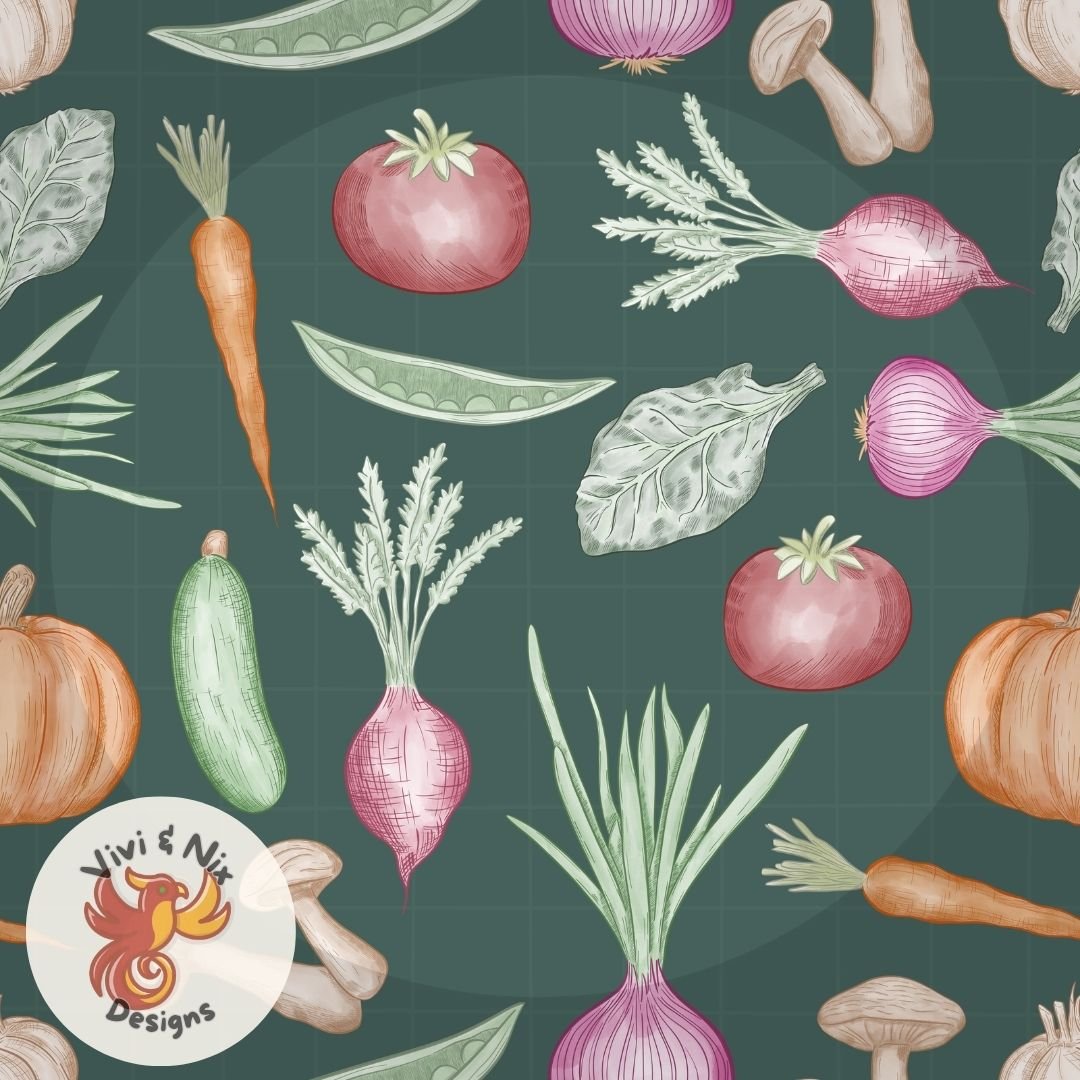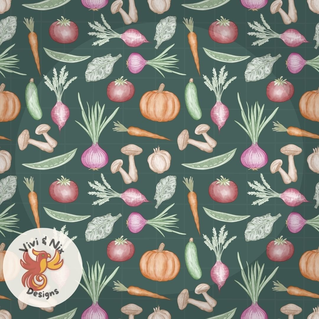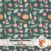 This hand drawn Kitchen Garden Seamless Pattern features a beautifully illustrated collection of vegetables including onions, carrots, pumpkins, mushrooms, tomatoes, cucumbers, peas, and leafy greens arranged in a timeless repeat.